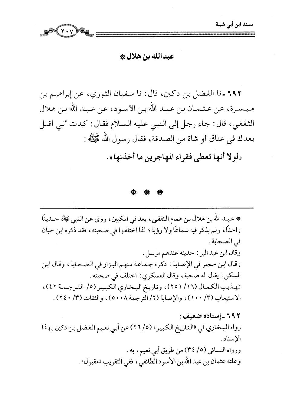 692 - نا الْفَضْلُ بْنُ دُكَيْنٍ، قَالَ: نا سُفْيَانُ الثَّوْرِيُّ، عَنْ إِبْرَاهِيمَ بْنِ مَيْسَرَةَ، عَنْ عُثْمَانَ بْنِ عَبْدِ اللَّهِ بْنِ الْأَسْوَدِ، عَنْ عَبْدِ اللَّهِ بْنِ هِلَالٍ الثَّقَفِيِّ، قَالَ: جَاءَ رَجُلٌ إِلَى النَّبِيِّ عَلَيْهِ السَّلَامُ فَقَالَ: كِدْتُ أَنِّي أُقْتَلُ بَعْدَكَ فِي عَنَاقٍ أَوْ شَاةٍ مِنَ الصَّدَقَةِ، فَقَالَ رَسُولُ اللَّهِ صَلَّى اللهُ عَلَيْهِ وَسَلَّمَ: «§لَوْلَا أَنَّهَا تُعْطَى فُقَرَاءَ الْمُهَاجِرِينَ مَا أَخَذْتُهَا»