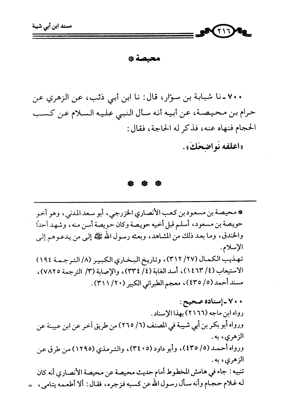 700 - نا شَبَابَةُ بْنُ سَوَّارٍ، قَالَ: نا ابْنُ أَبِي ذِئْبٍ، عَنِ الزُّهْرِيِّ، عَنْ حَرَامِ بْنِ مُحَيِّصَةَ، عَنْ أَبِيهِ، أَنَّهُ سَأَلَ النَّبِيَّ عَلَيْهِ السَّلَامُ عَنْ §كَسْبِ الْحَجَّامِ، فَنَهَاهُ عَنْهُ، فَذَكَرَ لَهُ الْحَاجَةَ، فَقَالَ: «اعْلِفْهُ نَوَاضِحَكَ»