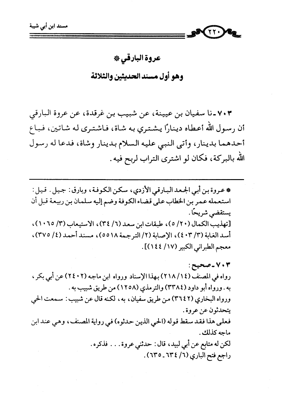 703 - نا سُفْيَانُ بْنُ عُيَيْنَةَ، عَنْ شَبِيبِ بْنِ غَرْقَدَةَ، عَنْ عُرْوَةَ الْبَارِقِيِّ، " أَنَّ رَسُولَ اللَّهِ §أَعْطَاهُ دِينَارًا يَشْتَرِي بِهِ شَاةً، فَاشْتَرَى لَهُ شَاتَيْنٍ، فَبَاعَ أَحَدَهُمَا بِدِينَارٍ، وَأَتَى النَّبِيَّ عَلَيْهِ السَّلَامُ بِدِينَارٍ وَشَاةٍ، فَدَعَا لَهُ رَسُولُ اللَّهِ بِالْبَرَكَةِ، فَكَانَ لَوِ اشْتَرَى التُّرَابَ لَرَبِحَ فِيهِ