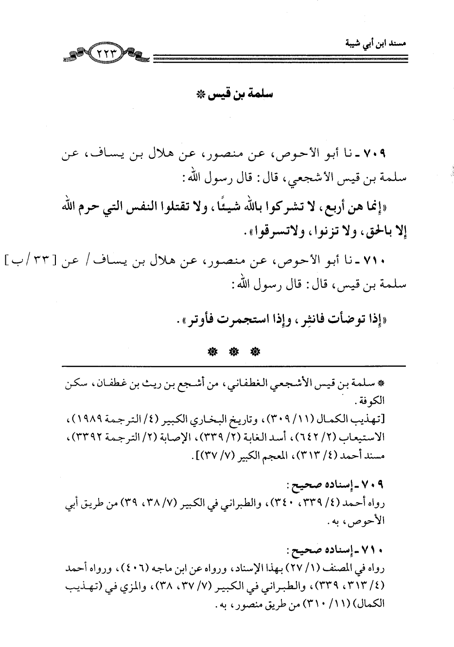 710 - نا أَبُو الْأَحْوَصِ، عَنْ مَنْصُورٍ، عَنْ هِلَالِ بْنِ يَسَافٍ، عَنْ سَلَمَةَ بْنِ قَيْسٍ، قَالَ: قَالَ رَسُولُ اللَّهِ: «§إِذَا تَوَضَّأْتَ فَانْثُرْ، وَإِذَا اسْتَجْمَرْتَ فَأَوْتِرْ»
