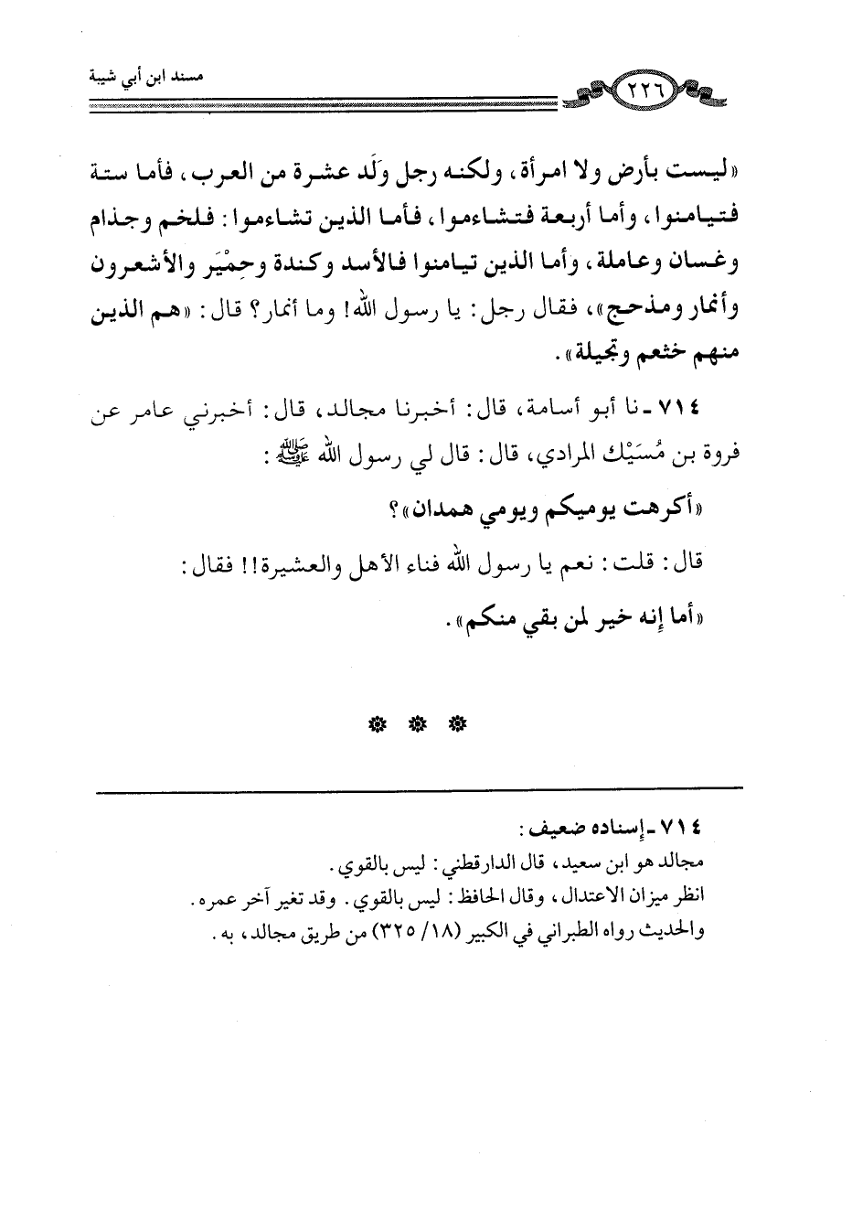 714 - نا أَبُو أُسَامَةَ، قَالَ: أَخْبَرَنَا مُجَالِدٌ، قَالَ: أَخْبَرَنِي عَامِرٌ، عَنْ فَرْوَةَ بْنِ مُسَيْكٍ الْمُرَادِيِّ، قَالَ: قَالَ لِي رَسُولُ اللَّهِ صَلَّى اللهُ عَلَيْهِ وَسَلَّمَ: «§أُكْرِهْتُ يَوْمَيْكُمْ وَيَوْمَيْ هَمْدَانَ؟» قَالَ: قُلْتُ: نَعَمْ يَا رَسُولَ اللَّهِ فَنَاءُ الْأَهْلِ وَالْعَشِيرَةِ، فَقَالَ: «أَمَا إِنَّهُ خَيْرٌ لِمَنْ بَقِيَ مِنْكُمْ»