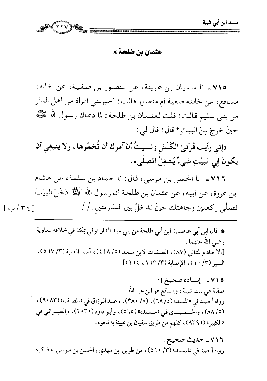 715 - نا سُفْيَانُ بْنُ عُيَيْنَةَ، عَنْ مَنْصُورِ بْنِ صَفِيَّةَ، عَنْ خَالِهِ مُسَافِعٍ، عَنْ خَالَتِهِ صَفِيَّةَ أُمِّ مَنْصُورٍ قَالَتْ: أَخْبَرَتْنِي امْرَأَةٌ، مِنْ أَهْلِ الدَّارِ مِنْ بَنِي سُلَيْمٍ، قَالَتْ: قُلْتُ لِعُثْمَانَ بْنِ طَلْحَةَ: لِمَا دَعَاكَ رَسُولُ اللَّهِ صَلَّى اللهُ عَلَيْهِ وَسَلَّمَ حِينَ خَرَجَ مِنَ الْبَيْتِ؟ قَالَ: قَالَ لِي: «إِنِّي رَأَيْتُ قَرْنَيِ الْكَبْشِ وَنَسِيتُ أَنْ آمُرَكَ أَنْ تُخَمِّرَهَا، §وَلَا يَنْبَغِي أَنْ يَكُونَ فِي الْبَيْتِ شَيْءٌ يَشْغَلُ الْمُصَلِّيَ»