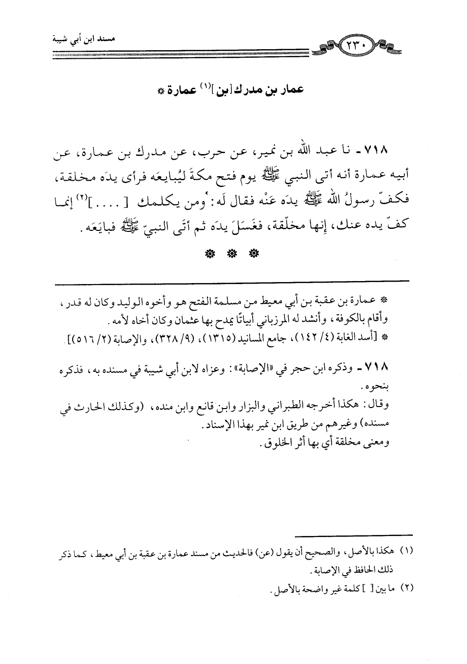 718 - نا عَبْدُ اللَّهِ بْنُ نُمَيْرٍ، عَنْ حَرْبٍ، عَنْ مُدْرِكِ بْنِ عُمَارَةَ، عَنْ أَبِيهِ عُمَارَةَ، أَنَّهُ أَتَى النَّبِيَّ صَلَّى اللهُ عَلَيْهِ وَسَلَّمَ يَوْمَ فَتْحِ مَكَّةَ لِيُبَايِعَهُ فَرَأَى يَدَهُ مُخَلَّقَةً، فَكَفَّ رَسُولُ اللَّهِ صَلَّى اللهُ عَلَيْهِ وَسَلَّمَ يَدَهُ عَنْهُ، فَقَالَ لَهُ: «وَمَنْ يُكَلِّمُكَ. . . . . . إِنَّمَا §كَفَّ يَدَهُ عَنْكَ، إِنَّهَا مُخَلَّقَةٌ» ، فَغَسَلَ يَدَهُ، ثُمَّ أَتَى النَّبِيَّ صَلَّى اللهُ عَلَيْهِ وَسَلَّمَ فَبَايَعَهُ