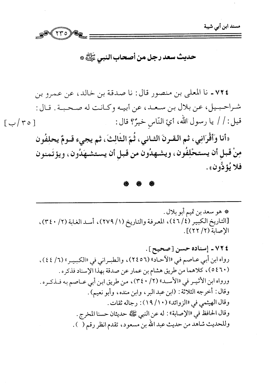 724 - نا الْمُعَلَّى بْنُ مَنْصُورٍ، قَالَ: نا صَدَقَةُ بْنُ خَالِدٍ، عَنْ عَمْرِو بْنِ شَرَاحِيلَ، عَنْ بِلَالِ بْنِ سَعْدٍ، عَنْ أَبِيهِ، وَكَانَتْ لَهُ صُحْبَةٌ، قَالَ: قِيلَ: يَا رَسُولَ اللَّهِ، §أَيُّ النَّاسِ خَيْرٌ؟ قَالَ: «أَنَا وَأَقْرَانِي، ثُمَّ الْقَرْنُ الثَّانِي، ثُمَّ الثَّالِثُ، ثُمَّ يَجِيءُ قَوْمٌ يَحْلِفُونَ مِنْ قَبْلِ أَنْ يُسْتَحْلَفُوا، وَيَشْهَدُونَ مِنْ قَبْلِ أَنْ يُسْتَشْهَدُوا، وَيُؤْتَمَنُونَ فَلَا يُؤَدُّونَ»