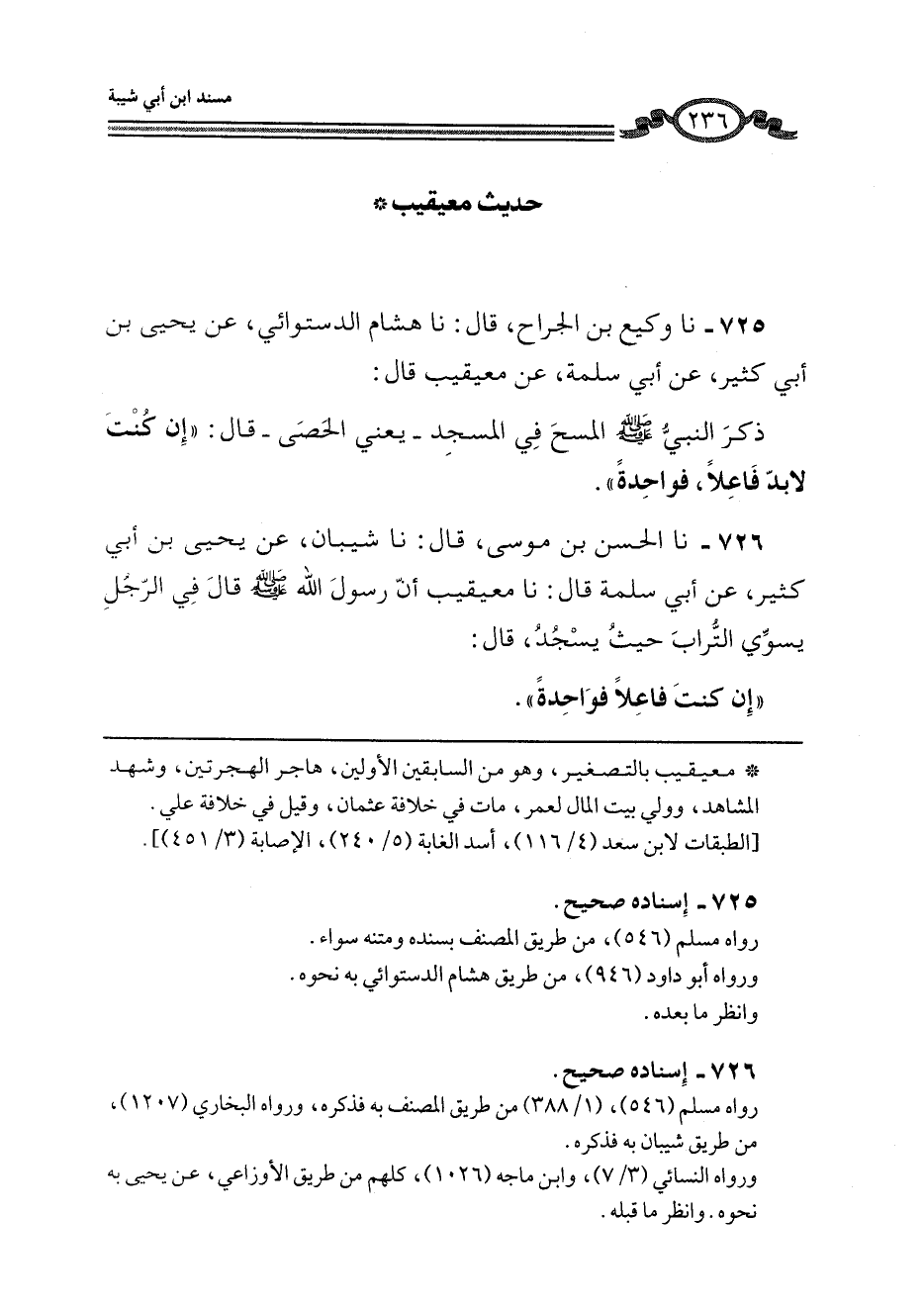 725 - نا وَكِيعُ بْنُ الْجَرَّاحِ، قَالَ: نا هِشَامٌ الدَّسْتُوَائِيُّ، عَنْ يَحْيَى بْنِ أَبِي كَثِيرٍ، عَنْ أَبِي سَلَمَةَ، عَنْ مُعَيْقِيبٍ، قَالَ: ذَكَرَ النَّبِيُّ صَلَّى اللهُ عَلَيْهِ وَسَلَّمَ §الْمَسْحَ فِي الْمَسْجِدِ - يَعْنِي الْحَصَى - قَالَ: «إِنْ كُنْتَ لَا بُدَّ فَاعِلًا، فَوَاحِدَةً»