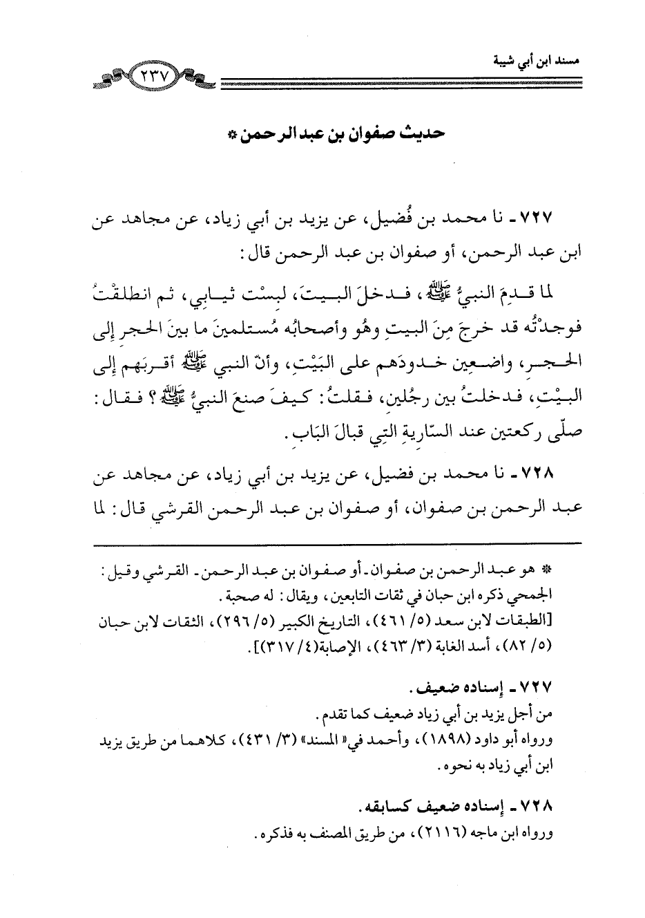727 - نا مُحَمَّدُ بْنُ فُضَيْلٍ، عَنْ يَزِيدَ بْنِ أَبِي زِيَادٍ، عَنْ مُجَاهِدٍ، عَنِ ابْنِ عَبْدِ الرَّحْمَنِ، أَوْ صَفْوَانَ بْنِ عَبْدِ الرَّحْمَنِ قَالَ: لَمَّا قَدِمَ النَّبِيُّ صَلَّى اللهُ عَلَيْهِ وَسَلَّمَ، فَدَخَلَ الْبَيْتَ، لَبِسْتُ ثِيَابِي، ثُمَّ انْطَلَقْتُ فَوَجَدْتُهُ قَدْ خَرَجَ مِنَ الْبَيْتِ وَهُوَ وَأَصْحَابُهُ مُسْتَلِمِينَ مَا بَيْنَ الْحِجْرِ إِلَى الْحَجَرِ، وَاضِعِينَ خُدُودَهُمْ عَلَى الْبَيْتِ، وَإِنَّ النَّبِيَّ صَلَّى اللهُ عَلَيْهِ وَسَلَّمَ أَقْرَبَهُمْ إِلَى الْبَيْتِ، فَدَخَلْتُ بَيْنَ رَجُلَيْنِ، فَقُلْتُ: كَيْفَ صَنَعَ النَّبِيُّ صَلَّى اللهُ عَلَيْهِ وَسَلَّمَ؟ فَقَالَ: «§صَلَّى رَكْعَتَيْنِ عِنْدَ السَّارِيَةِ الَّتِي قُبَالَ الْبَابِ»