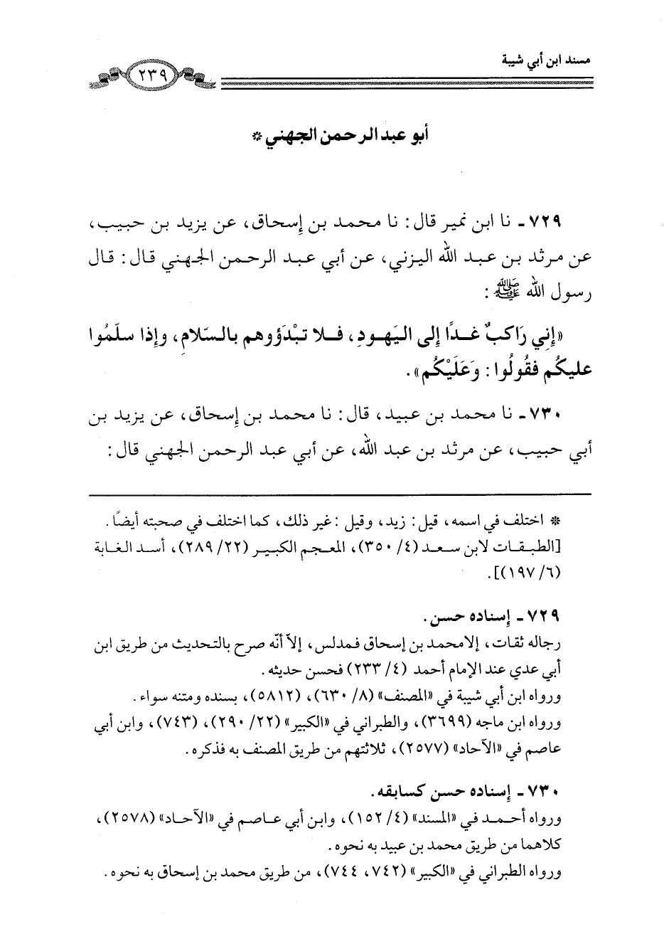 729 - نا ابْنُ نُمَيْرٍ، قَالَ: نا مُحَمَّدُ بْنُ إِسْحَاقَ، عَنْ يَزِيدَ بْنِ حَبِيبٍ، عَنْ مَرْثَدِ بْنِ عَبْدِ اللَّهِ الْيَزَنِيِّ، عَنْ أَبِي عَبْدِ الرَّحْمَنِ الْجُهَنِيِّ، قَالَ: قَالَ رَسُولُ اللَّهِ صَلَّى اللهُ عَلَيْهِ وَسَلَّمَ: " إِنِّي رَاكِبٌ غَدًا إِلَى §الْيَهُودِ، فَلَا تَبْدَءُوهُمْ بِالسَّلَامِ، وَإِذَا سَلَّمُوا عَلَيْكُمْ فَقُولُوا: وَعَلَيْكُمْ "