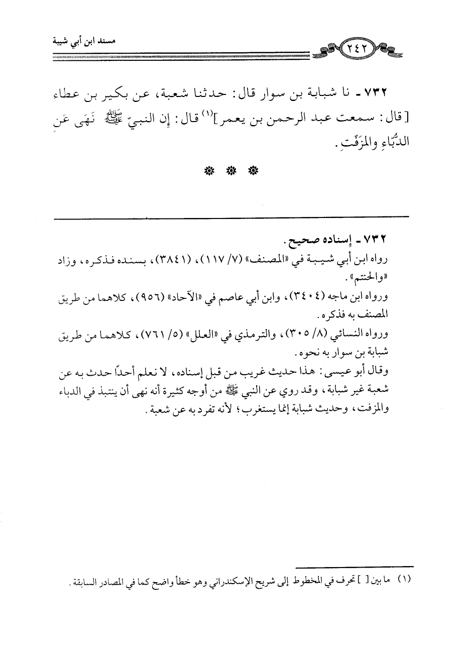 732 - نا شَبَابَةُ بْنُ سَوَّارٍ، قَالَ: حَدَّثَنَا شُعْبَةُ، عَنْ بُكَيْرِ بْنِ عَطَاءٍ، قَالَ: سَمِعْتُ عَبْدَ الرَّحْمَنِ بْنِ يَعْمَرَ، قَالَ: إِنَّ النَّبِيَّ صَلَّى اللهُ عَلَيْهِ وَسَلَّمَ «§نَهَى عَنِ الدُّبَّاءِ، وَالْمُزَفَّتِ»