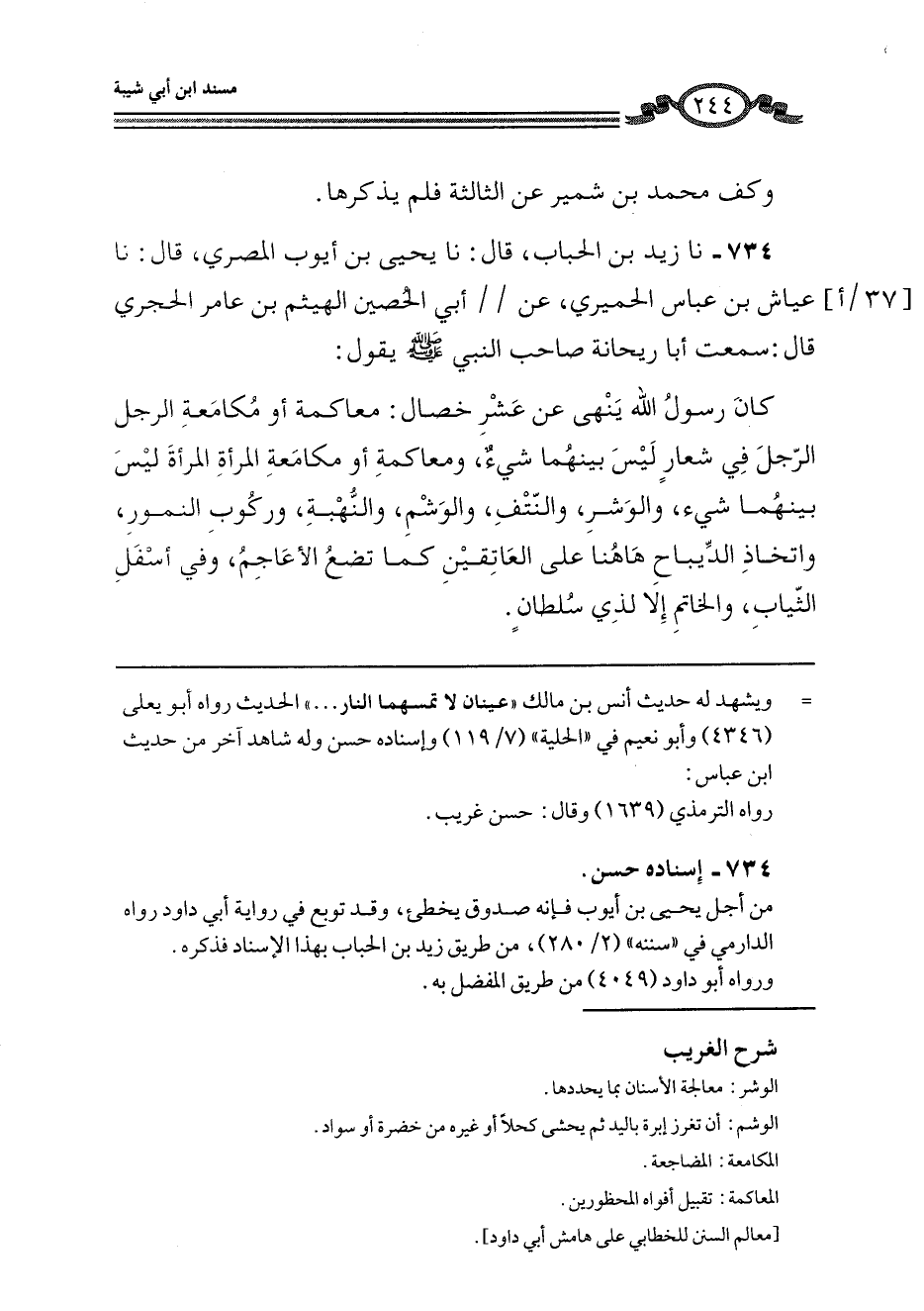734 - نا زَيْدُ بْنُ الْحُبَابِ، قَالَ: نا يَحْيَى بْنُ أَيُّوبَ الْمِصْرِيُّ، قَالَ: نا عَيَّاشُ بْنُ عَبَّاسٍ الْحِمْيَرِيُّ، عَنْ أَبِي الْحُصَيْنِ الْهَيْثَمِ بْنِ عَامِرٍ الْحَجْرِيِّ قَالَ: سَمِعْتُ أَبَا رَيْحَانَةَ، صَاحِبَ النَّبِيِّ صَلَّى اللهُ عَلَيْهِ وَسَلَّمَ يَقُولُ: كَانَ رَسُولُ اللَّهِ " §يَنْهَى عَنْ عَشْرِ خِصَالٍ: مَعَاكَمَةِ - أَوْ مُكَامَعَةِ - الرَّجُلِ الرَّجُلَ فِي شِعَارٍ لَيْسَ بَيْنَهُمَا شَيْءٌ، وَمَعَاكَمَةِ - أَوْ مُكَامَعَةِ - الْمَرْأَةِ الْمَرْأَةَ لَيْسَ بَيْنَهُمَا شَيْءٌ، وَالْوَشْرِ، وَالنَّتْفِ، وَالْوَشْمِ، وَالنُّهْبَةِ، وَرُكُوبِ النُّمُورِ، وَاتِّخَاذِ الدِّيبَاجِ هَاهُنَا عَلَى الْعَاتِقَيْنِ كَمَا تَضَعُ الْأَعَاجِمُ، وَفِي أَسْفَلِ الثِّيَابِ، وَالْخَاتَمِ إِلَّا لِذِي سُلْطَانٍ "