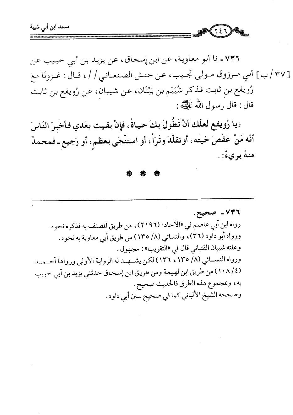 736 - نا أَبُو مُعَاوِيَةَ، عَنِ ابْنِ إِسْحَاقَ، عَنْ يَزِيدَ بْنِ أَبِي حَبِيبٍ، عَنْ أَبِي مَرْزُوقٍ مَوْلَى تُجِيبَ، عَنْ حَنَشٍّ الصَّنْعَانِيِّ، قَالَ: غَزَوْنَا مَعَ رُوَيْفِعِ بْنِ ثَابِتٍ، فَذَكَرَ شُيَيْمُ بْنُ بَيْتَانَ، عَنْ شَيْبَانَ، عَنْ رُوَيْفِعِ بْنِ ثَابِتٍ، قَالَ: قَالَ رَسُولُ اللَّهِ صَلَّى اللهُ عَلَيْهِ وَسَلَّمَ: «يَا رُوَيْفِعُ لَعَلَّكَ أَنْ تَطُولَ بِكَ حَيَاةٌ، فَإِنْ بَقِيتَ بَعْدِي فَأَخْبِرِ النَّاسَ أَنَّهُ §مَنْ عَقَصَ لِحْيَتَهُ، أَوْ تَقَلَّدَ وِتْرًا، أَوِ اسْتَنْجَى بِعَظْمٍ، أَوْ رَجِيعٍ، فَمُحَمَّدٌ مِنْهُ بَرِيءٌ»