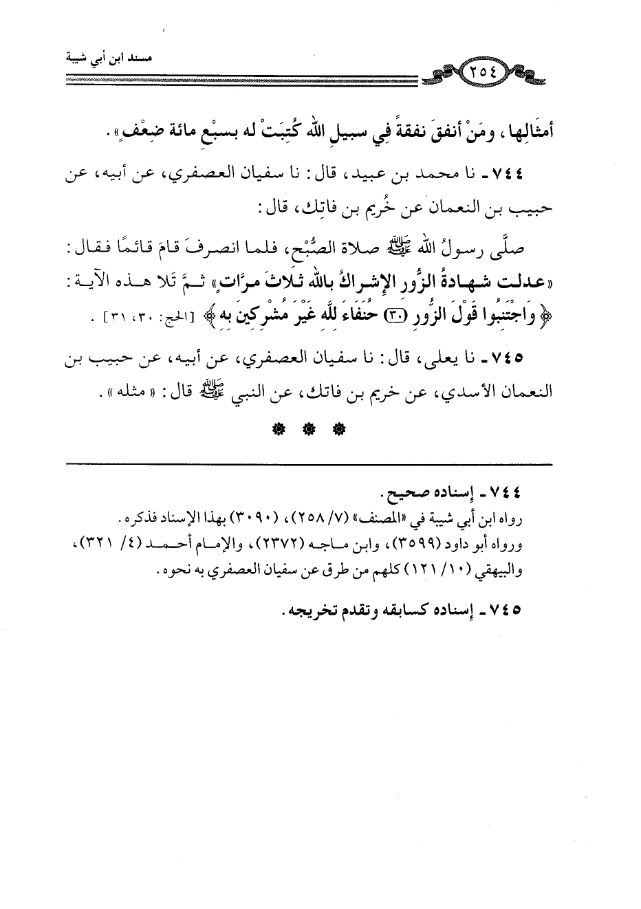744 - نا مُحَمَّدُ بْنُ عُبَيْدٍ، قَالَ: نا سُفْيَانُ الْعُصْفُرِيُّ، عَنْ أَبِيهِ، عَنْ حَبِيبِ بْنِ النُّعْمَانِ، عَنْ خُرَيْمِ بْنِ فَاتِكٍ، قَالَ: صَلَّى رَسُولُ اللَّهِ صَلَّى اللهُ عَلَيْهِ وَسَلَّمَ صَلَاةَ الصُّبْحِ، فَلَمَّا انْصَرَفَ قَامَ قَائِمًا فَقَالَ: «§عَدَلَتْ شَهَادَةُ الزُّورِ الْإِشْرَاكَ بِاللَّهِ ثَلَاثَ مَرَّاتٍ» ثُمَّ تَلَا هَذِهِ الْآيَةَ: {وَاجْتَنِبُوا قَوْلَ الزُّورِ حُنَفَاءَ لِلَّهِ غَيْرَ مُشْرِكِينَ بِهِ} [الحج: 31] .