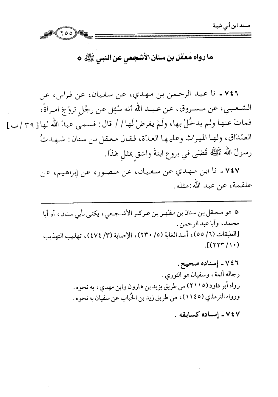 746 - نا عَبْدُ الرَّحْمَنِ بْنُ مَهْدِيٍّ، عَنْ سُفْيَانَ، عَنْ فِرَاسٍ، عَنِ الشَّعْبِيِّ، عَنْ مَسْرُوقٍ، عَنْ عَبْدِ اللَّهِ، أَنَّهُ سُئِلَ عَنْ رَجُلٍ تَزَوَّجَ امْرَأَةً، فَمَاتَ عَنْهَا وَلَمْ يَدْخُلْ بِهَا، وَلَمْ يَفْرِضْ لَهَا قَالَ: فَسَمَّى عَبْدُ اللَّهِ لَهَا الصَّدَاقَ، وَلَهَا الْمِيرَاثُ وَعَلَيْهَا الْعِدَّةُ، فَقَالَ مَعْقِلُ بْنُ سِنَانٍ: شَهِدْتُ رَسُولَ اللَّهِ صَلَّى اللهُ عَلَيْهِ وَسَلَّمَ «§قَضَى فِي بَرُوعَ ابْنَةِ وَاشِقٍ بِمِثْلِ هَذَا»