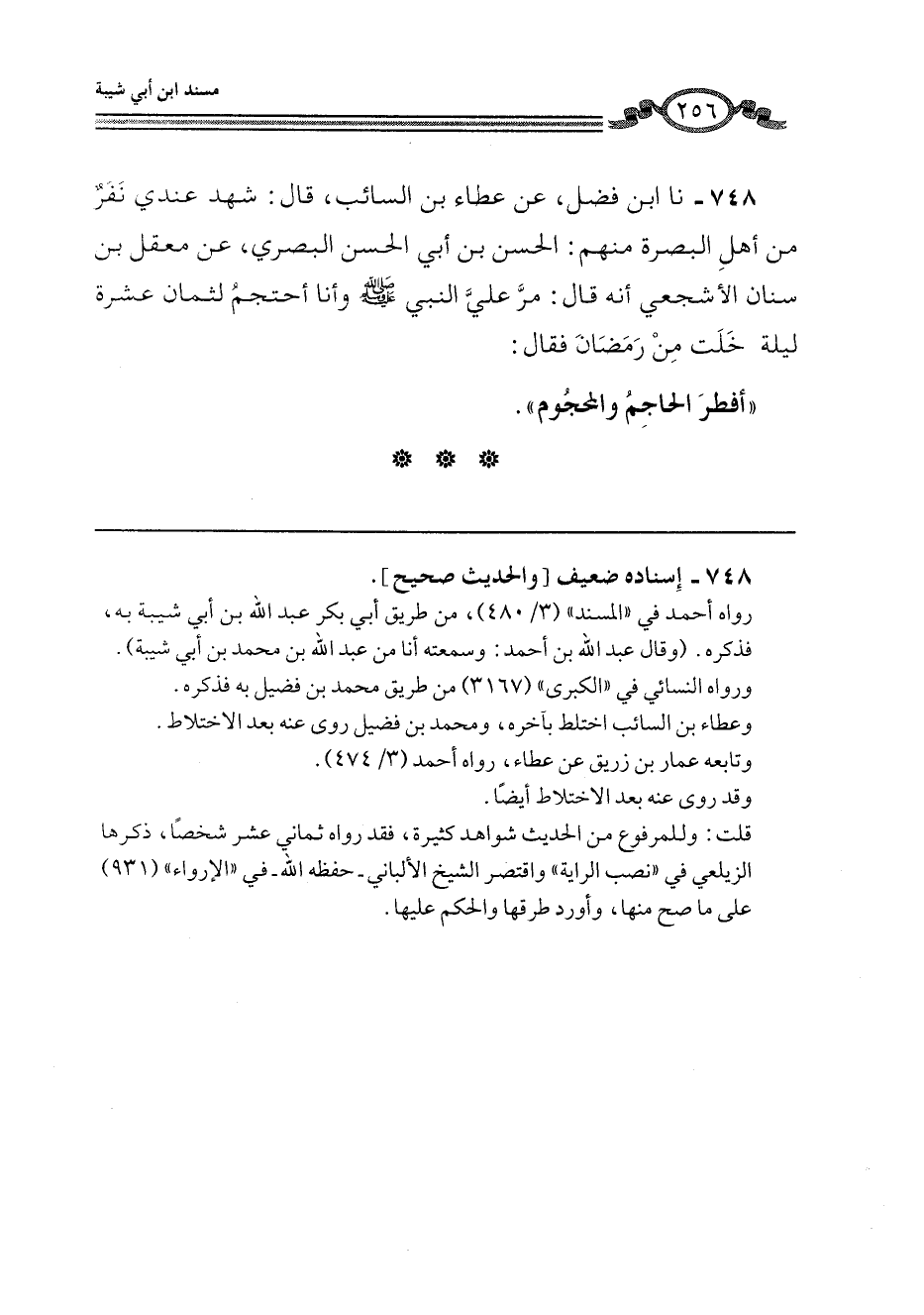748 - نا ابْنُ فَضْلٍ، عَنْ عَطَاءِ بْنِ السَّائِبِ، قَالَ: شَهِدَ عِنْدِي نَفَرٌ مِنْ أَهْلِ الْبَصْرَةِ مِنْهُمُ الْحَسَنُ بْنُ أَبِي الْحَسَنِ الْبَصْرِيُّ، عَنْ مَعْقِلِ بْنِ سِنَانٍ الْأَشْجَعِيِّ أَنَّهُ قَالَ: مَرَّ عَلَيَّ النَّبِيُّ صَلَّى اللهُ عَلَيْهِ وَسَلَّمَ وَأَنَا أَحْتَجِمُ لِثَمَانِ عَشْرَةَ لَيْلَةً خَلَتْ مِنْ رَمَضَانَ فَقَالَ: «§أَفْطَرَ الْحَاجِمُ وَالْمَحْجُومُ»