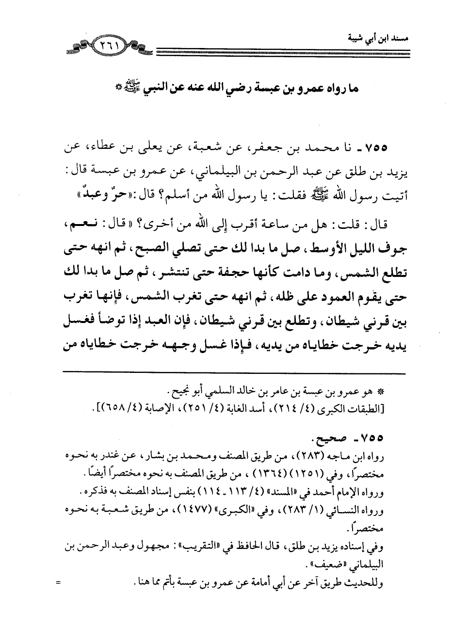 755 - نا مُحَمَّدُ بْنُ جَعْفَرٍ، عَنْ شُعْبَةَ، عَنْ يَعْلَى بْنِ عَطَاءٍ، عَنْ يَزِيدَ بْنِ طَلْقٍ، عَنْ عَبْدِ الرَّحْمَنِ بْنِ الْبَيْلَمَانِيِّ، عَنْ عَمْرِو بْنِ عَبَسَةَ، قَالَ: أَتَيْتُ رَسُولَ اللَّهِ صَلَّى اللهُ عَلَيْهِ وَسَلَّمَ فَقُلْتُ: يَا رَسُولَ اللَّهِ مَنْ أَسْلَمَ؟ قَالَ: «حُرٌّ وَعَبْدٌ» قَالَ: قُلْتُ: هَلْ مِنْ سَاعَةٍ أَقْرَبُ إِلَى اللَّهِ مِنْ أُخْرَى؟ قَالَ: «نَعَمْ، §جَوْفُ اللَّيْلِ الْأَوْسَطُ، صَلِّ مَا بَدَا لَكَ حَتَّى تُصَلِّيَ الصُّبْحَ، ثُمَّ انْهَهُ حَتَّى تَطْلُعَ الشَّمْسُ، وَمَا دَامَتْ كَأَنَّهَا جَحَفَةٌ حَتَّى تَنْتَشِرَ، ثُمَّ صَلِّ مَا بَدَا لَكَ حَتَّى يَقُومَ الْعَمُودُ عَلَى ظِلِّهِ، ثُمَّ انْهَهُ حَتَّى تَغْرُبَ الشَّمْسُ، فَإِنَّهَا تَغْرُبُ بَيْنَ قَرْنَيْ شَيْطَانٍ، وَتَطْلُعُ بَيْنَ قَرْنَيْ شَيْطَانٍ، فَإِنَّ الْعَبْدَ إِذَا تَوَضَّأَ فَغَسَلَ يَدَيْهِ خَرَجَتْ خَطَايَاهُ مِنْ يَدَيْهِ، فَإِذَا غَسَلَ وَجْهَهُ خَرَجَتْ خَطَايَاهُ مِنْ -[262]- وَجْهِهِ، وَإِذَا غَسَلَ ذِرَاعَيْهِ وَمَسَحَ بِرَأْسِهِ خَرَجَتْ خَطَايَاهُ مِنْ ذِرَاعَيْهِ وَرَأْسِهِ، وَإِذَا غَسَلَ رِجْلَيْهِ خَرَجَتْ خَطَايَاهُ مِنْ رِجْلَيْهِ، فَإِذَا قَامَ إِلَى الصَّلَاةِ وَكَانَ هَوَاهُ وَقَلْبُهُ وَوَجْهُهُ أَوْ كُلُّهُ نَحْوَ الْوَجْهِ إِلَى اللَّهِ انْصَرَفَ كَمَا وَلَدَتْهُ أُمُّهُ» . قَالَ: فَقِيلَ لَهُ: أَنْتَ سَمِعْتَ هَذَا مِنْ رَسُولِ اللَّهِ صَلَّى اللهُ عَلَيْهِ وَسَلَّمَ؟ فَقَالَ: لَوْ لَمْ أَسْمَعْهُ إِلَّا مَرَّةً أَوْ مَرَّتَيْنِ أَوْ عَشْرًا أَوْ عِشْرِينَ، مَا حَدَّثْتُ بِهِ