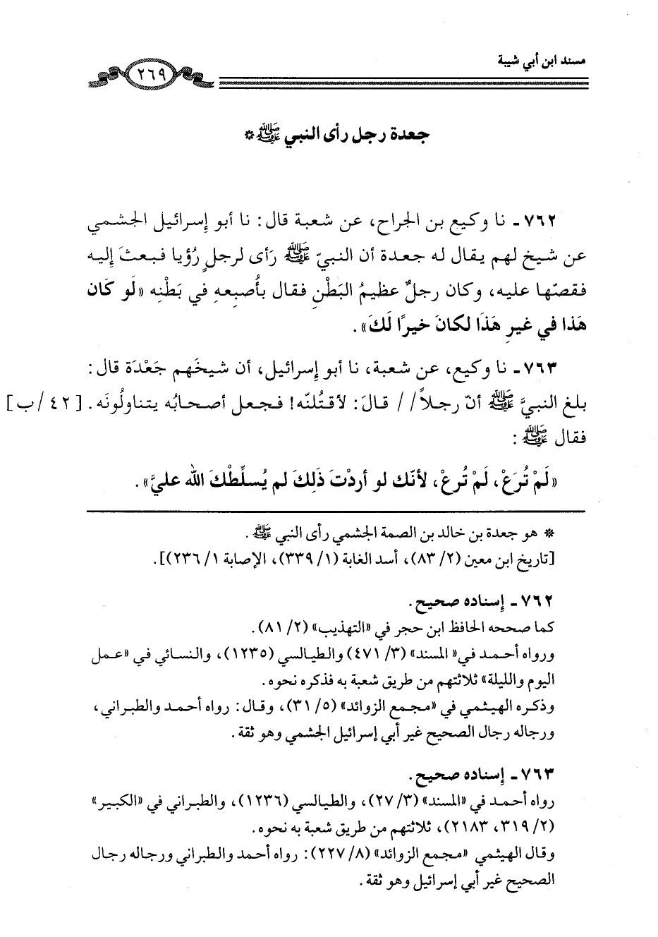 762 - نا وَكِيعُ بْنُ الْجَرَّاحِ، عَنْ شُعْبَةَ، قَالَ: نا أَبُو إِسْرَائِيلَ الْجُشَمِيُّ، عَنْ شَيْخٍ لَهُمْ يُقَالُ لَهُ جَعْدَةُ، أَنَّ النَّبِيَّ صَلَّى اللهُ عَلَيْهِ وَسَلَّمَ §رَأَى لِرَجُلٍ رُؤْيَا فَبَعَثَ إِلَيْهِ فَقَصَّهَا عَلَيْهِ، وَكَانَ رَجُلًا عَظِيمَ الْبَطْنِ فَقَالَ بِأُصْبُعِهِ فِي بَطْنِهِ: «لَوْ كَانَ هَذَا فِي غَيْرِ هَذَا لَكَانَ خَيْرًا لَكَ»