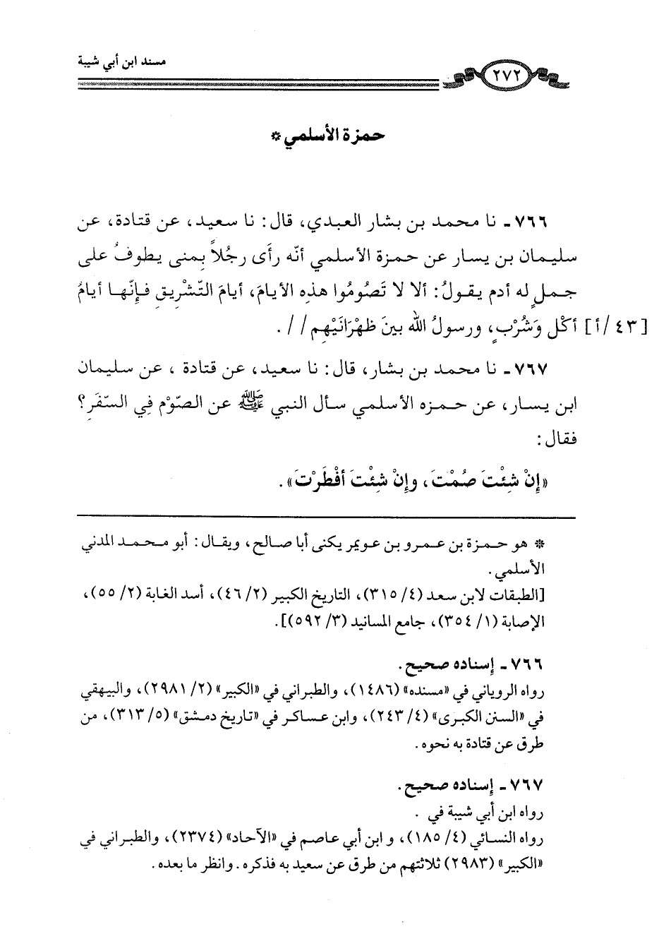 766 - نا مُحَمَّدُ بْنُ بَشَّارٍ الْعَبْدِيُّ، قَالَ: نا سَعِيدٌ، عَنْ قَتَادَةَ، عَنْ سُلَيْمَانَ بْنِ يَسَارٍ، عَنْ حَمْزَةَ الْأَسْلَمِيِّ، أَنَّهُ رَأَى رَجُلًا بِمِنًى يَطُوفُ عَلَى جَمَلٍ لَهُ آدَمُ يَقُولُ: «§أَلَا لَا تَصُومُوا هَذِهِ الْأَيَّامَ، أَيَّامَ التَّشْرِيقِ فَإِنَّهَا أَيَّامُ أَكْلٍ وَشُرْبٍ، وَرَسُولُ اللَّهِ بَيْنَ ظَهْرَانَيْهِمْ»