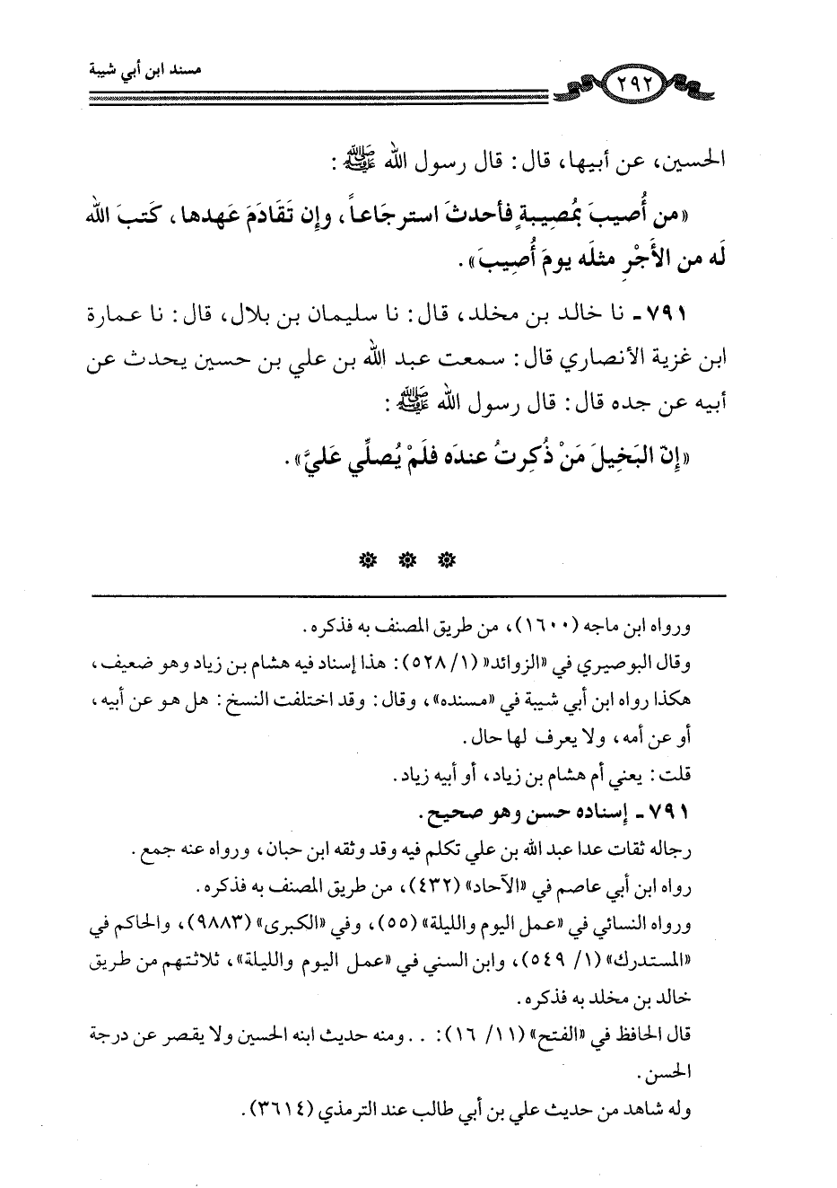 791 - نا خَالِدُ بْنُ مَخْلَدٍ، قَالَ: نا سُلَيْمَانُ بْنُ بِلَالٍ، قَالَ: نا عُمَارَةُ بْنُ غَزِيَّةَ الْأَنْصَارِيُّ، قَالَ: سَمِعْتُ عَبْدَ اللَّهِ بْنَ عَلِيِّ بْنِ حُسَيْنٍ، يُحَدِّثُ، عَنْ أَبِيهِ، عَنْ جَدِّهِ، قَالَ: قَالَ رَسُولُ اللَّهِ صَلَّى اللهُ عَلَيْهِ وَسَلَّمَ: «إِنَّ §الْبَخِيلَ مَنْ ذُكِرْتُ عِنْدَهُ فَلَمْ يُصَلِّ عَلَيَّ»