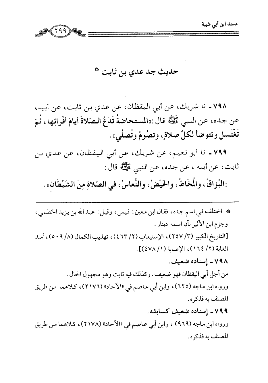 799 - نا أَبُو نُعَيْمٍ، عَنْ شَرِيكٍ، عَنْ أَبِي الْيَقْظَانِ، عَنْ عَدِيِّ بْنِ ثَابِتٍ، عَنْ أَبِيهِ، عَنْ جَدِّهِ، عَنِ النَّبِيِّ صَلَّى اللهُ عَلَيْهِ وَسَلَّمَ قَالَ: «§الْبُزَاقُ، وَالْمُخَاطُ، وَالْحَيْضُ، وَالنُّعَاسُ، فِي الصَّلَاةِ مِنَ الشَّيْطَانِ»