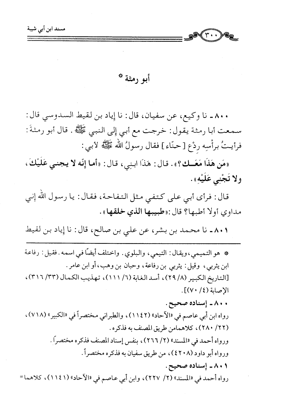 800 - نا وَكِيعٌ، عَنْ سُفْيَانَ، قَالَ: نا إِيَادُ بْنُ لَقِيطٍ السَّدُوسِيُّ، قَالَ: سَمِعْتُ أَبَا رِمْثَةَ، يَقُولُ: خَرَجْتُ مَعَ أَبِي إِلَى النَّبِيِّ صَلَّى اللهُ عَلَيْهِ وَسَلَّمَ، قَالَ أَبُو رِمْثَةَ: فَرَأَيْتُ بِرَأْسِهِ رَدْعَ حِنَّاءً فَقَالَ رَسُولُ اللَّهِ صَلَّى اللهُ عَلَيْهِ وَسَلَّمَ لِأَبِي: «مَنْ هَذَا مَعَكَ؟» قَالَ: هَذَا ابْنِي، قَالَ: «§أَمَا إِنَّهُ لَا يَجْنِي عَلَيْكَ، وَلَا تَجْنِي عَلَيْهِ» قَالَ: فَرَأَى أَبِي عَلَى كَتِفِي مِثْلَ التُّفَّاحَةِ، فَقَالَ: يَا رَسُولَ اللَّهِ إِنِّي مُدَاوٍ أَوَلَا أُطِبُّهَا؟ قَالَ: «طَبِيبُهَا الَّذِي خَلَقَهَا»