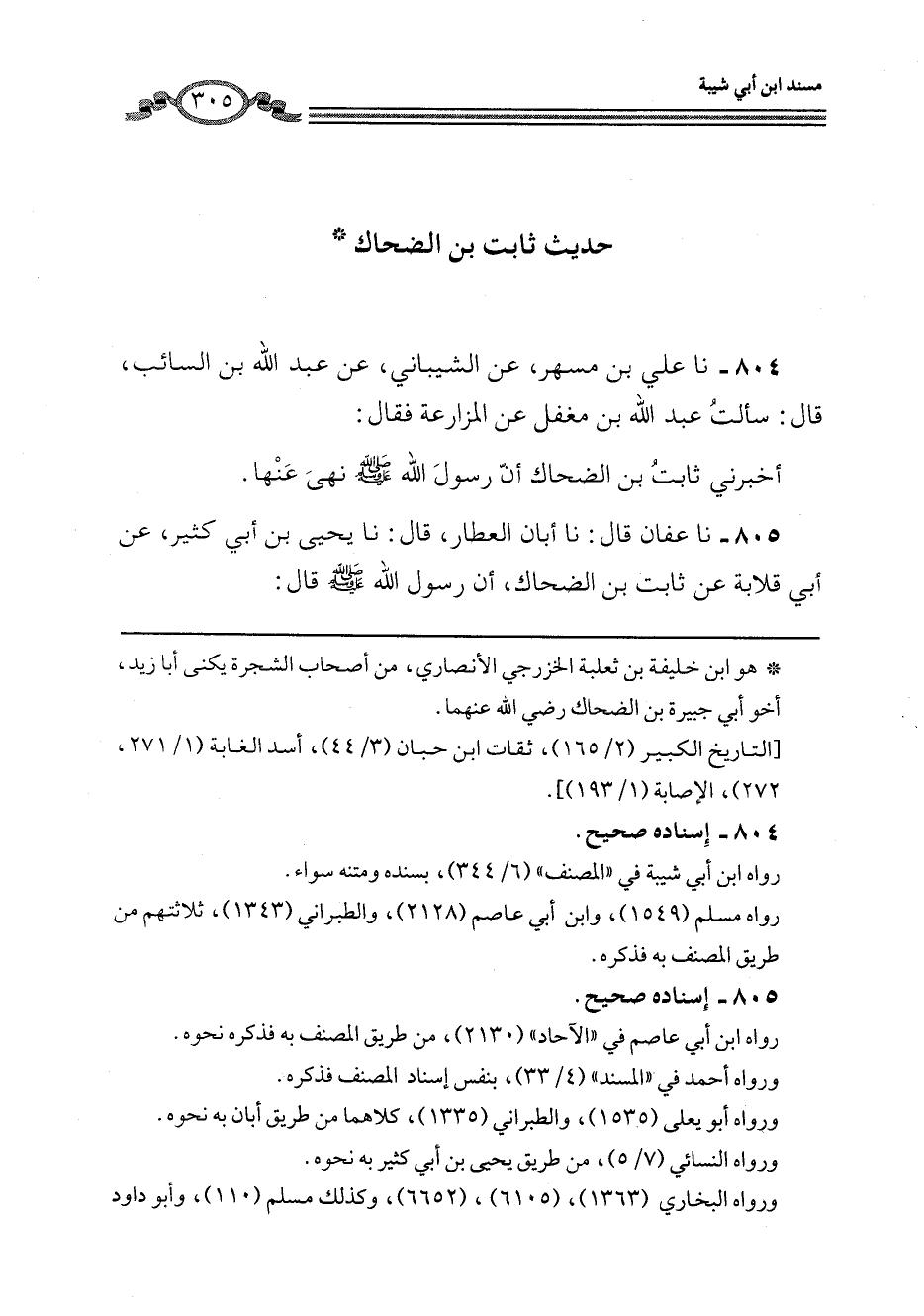 804 - نا عَلِيُّ بْنُ مُسْهِرٍ، عَنِ الشَّيْبَانِيِّ، عَنْ عَبْدِ اللَّهِ بْنِ السَّائِبِ، قَالَ: §سَأَلْتُ عَبْدَ اللَّهِ بْنَ مُغَفَّلٍ عَنِ الْمُزَارَعَةِ، فَقَالَ: أَخْبَرَنِي ثَابِتُ بْنُ الضَّحَّاكِ، أَنَّ رَسُولَ اللَّهِ صَلَّى اللهُ عَلَيْهِ وَسَلَّمَ نَهَى عَنْهَا