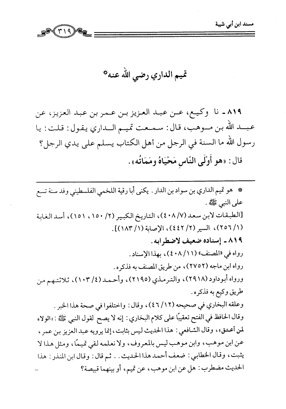 819 - نا وَكِيعٌ، عَنْ عَبْدِ الْعَزِيزِ بْنِ عُمَرَ بْنِ عَبْدِ الْعَزِيزِ، عَنْ عَبْدِ اللَّهِ بْنِ مَوْهَبٍ، قَالَ: سَمِعْتُ تَمِيمًا الدَّارِيَّ، يَقُولُ: قُلْتُ: يَا رَسُولَ اللَّهِ §مَا السُّنَّةُ فِي الرَّجُلِ مِنْ أَهْلِ الْكِتَابِ يُسْلِمُ عَلَى يَدَيِ الرَّجُلِ؟ قَالَ: «هُوَ أَوْلَى النَّاسِ مَحْيَاهُ وَمَمَاتَهُ»