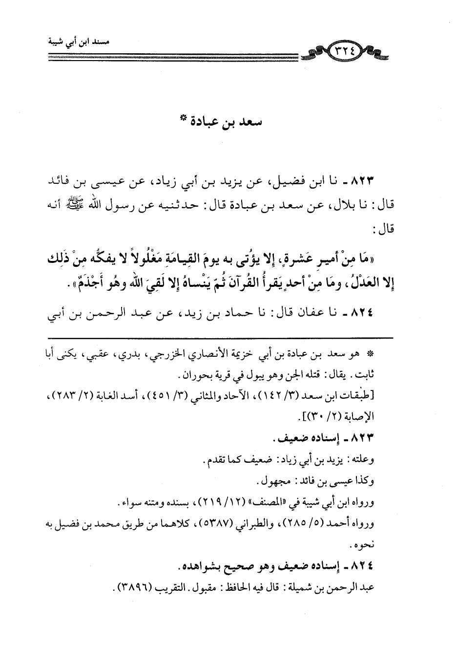 823 - نا ابْنُ فُضَيْلٍ، عَنْ يَزِيدَ بْنِ أَبِي زِيَادٍ، عَنْ عِيسَى بْنِ فَائِدٍ، قَالَ: نا بِلَالٌ، عَنْ سَعْدِ بْنِ عُبَادَةَ، قَالَ: حَدَّثَنِيهِ عَنْ رَسُولِ اللَّهِ صَلَّى اللهُ عَلَيْهِ وَسَلَّمَ أَنَّهُ قَالَ: «§مَا مِنْ أَمِيرِ عَشَرَةٍ، إِلَّا يُؤْتَى بِهِ يَوْمَ الْقِيَامَةِ مَغْلُولًا لَا يَفُكُّهُ مِنْ ذَلِكَ إِلَّا الْعَدْلُ، وَمَا مِنْ أَحَدٍ يَقْرَأُ الْقُرْآنَ ثُمَّ يَنْسَاهُ إِلَّا لَقِيَ اللَّهَ وَهُوَ أَجْذَمُ»