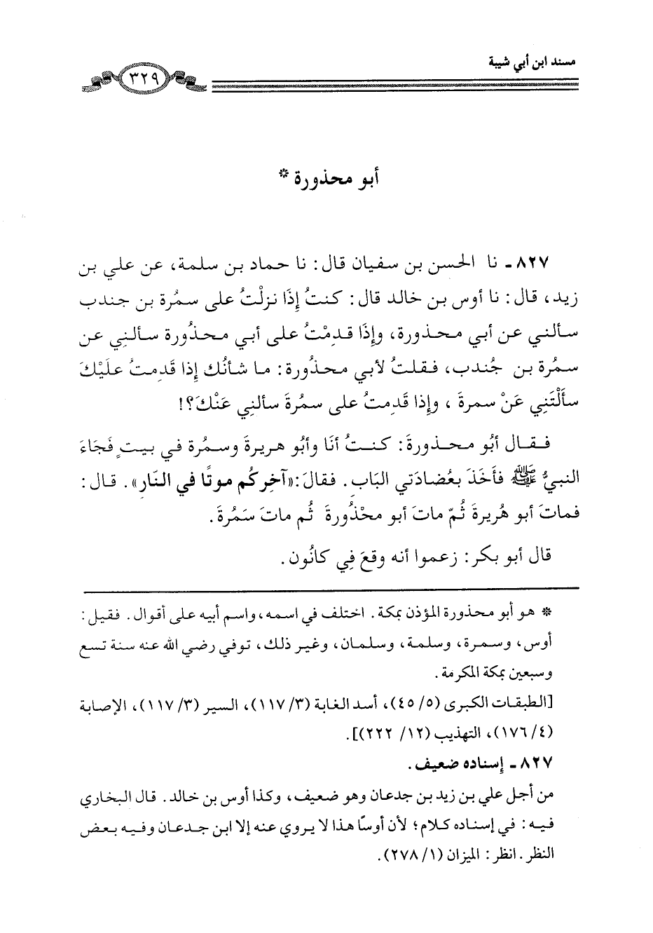 827 - نا الْحَسَنُ بْنُ سُفْيَانَ، قَالَ: نا حَمَّادُ بْنُ سَلَمَةَ، عَنْ عَلِيِّ بْنِ زَيْدٍ، قَالَ: نا أَوْسُ بْنُ خَالِدٍ، قَالَ: كُنْتُ إِذَا نَزَلَتْ عَلَى سَمُرَةَ بْنِ جُنْدُبٍ سَأَلَنِي عَنْ أَبِي مَحْذُورَةَ، وَإِذَا قَدِمْتُ عَلَى أَبِي مَحْذُورَةَ سَأَلَنِي عَنْ سَمُرَةَ بْنِ جُنْدُبٍ، فَقُلْتُ لِأَبِي مَحْذُورَةَ: مَا شَأْنُكَ إِذَا قَدِمْتُ عَلَيْكَ سَأَلْتَنِي عَنْ سَمُرَةَ، وَإِذَا قَدِمْتُ عَلَى سَمُرَةَ سَأَلَنِي عَنْكَ؟ فَقَالَ أَبُو مَحْذُورَةَ: كُنْتُ أَنَا وَأَبُو هُرَيْرَةَ وَسَمُرَةُ فِي بَيْتٍ فَجَاءَ النَّبِيُّ صَلَّى اللهُ عَلَيْهِ وَسَلَّمَ فَأَخَذَ بِعِضَادَتَيِ الْبَابِ. فَقَالَ: «§آخِرُكُمْ مَوْتًا فِي النَّارِ» ، قَالَ: فَمَاتَ أَبُو هُرَيْرَةَ، ثُمَّ مَاتَ أَبُو مَحْذُورَةَ، ثُمَّ مَاتَ سَمُرَةُ. قَالَ أَبُو بَكْرٍ: «زَعَمُوا أَنَّهُ وَقَعَ فِي كَانُونٍ»