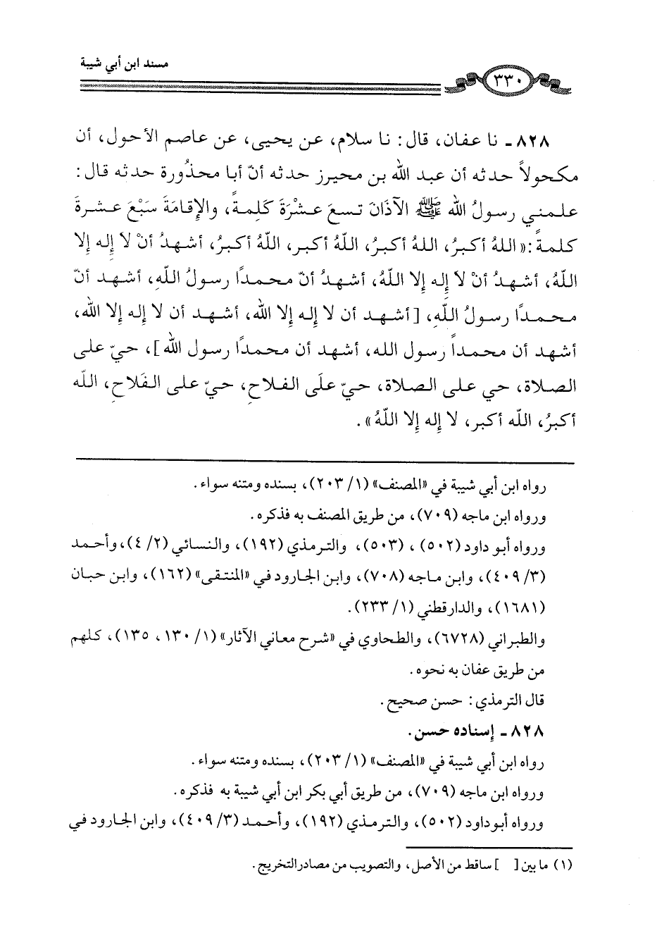 828 - نا عَفَّانُ، قَالَ: نا سَلَامٌ، عَنْ يَحْيَى، عَنْ عَاصِمٍ الْأَحْوَلِ، أَنَّ مَكْحُولًا، حَدَّثَهُ، أَنَّ عَبْدَ اللَّهِ بْنَ مُحَيْرِيزٍ حَدَّثَهُ، أَنَّ أَبَا مَحْذُورَةَ حَدَّثَهُ قَالَ: " عَلِّمْنِي رَسُولُ اللَّهِ صَلَّى اللهُ عَلَيْهِ وَسَلَّمَ §الْآذَانَ تِسْعَ عَشْرَةَ كَلِمَةً، وَالْإِقَامَةَ سَبْعَ عَشْرَةَ كَلِمَةً: اللَّهُ أَكْبَرُ، اللَّهُ أَكْبَرُ، اللَّهُ أَكْبَرُ، اللَّهُ أَكْبَرُ، أَشْهَدُ أَنْ لَا إِلَهَ إِلَّا اللَّهُ، أَشْهَدُ أَنْ لَا إِلَهَ إِلَّا اللَّهُ، أَشْهَدُ أَنَّ مُحَمَّدًا رَسُولُ اللَّهِ، أَشْهَدُ أَنَّ مُحَمَّدًا رَسُولُ اللَّهِ، أَشْهَدُ أَنْ لَا إِلَهَ إِلَّا اللَّهُ، أَشْهَدُ أَنْ لَا إِلَهَ إِلَّا اللَّهُ، أَشْهَدُ أَنَّ مُحَمَّدًا رَسُولُ اللَّهِ، أَشْهَدُ أَنَّ مُحَمَّدًا رَسُولُ اللَّهِ، حَيَّ عَلَى الصَّلَاةِ، حَيَّ عَلَى الصَّلَاةِ، حَيَّ عَلَى الْفَلَاحِ، حَيَّ عَلَى الْفَلَاحِ، اللَّهُ أَكْبَرُ، اللَّهُ أَكْبَرُ، لَا إِلَهَ إِلَّا اللَّهُ -[331]-. وَالْإِقَامَةُ سَبْعَ عَشْرَةَ كَلِمَةً: اللَّهُ أَكْبَرُ، اللَّهُ أَكْبَرُ، أَشْهَدُ أَنْ لَا إِلَهَ إِلَّا اللَّهُ، أَشْهَدُ أَنْ لَا إِلَهَ إِلَّا اللَّهُ، أَشْهَدُ أَنَّ مُحَمَّدًا رَسُولُ اللَّهِ، أَشْهَدُ أَنَّ مُحَمَّدًا رَسُولُ اللَّهِ، حَيَّ عَلَى الصَّلَاةِ، حَيَّ عَلَى الصَّلَاةِ، حَيَّ عَلَى الْفَلَاحِ، حَيَّ عَلَى الْفَلَاحِ، قَدْ قَامَتِ الصَّلَاةُ، اللَّهُ أَكْبَرُ، اللَّهُ أَكْبَرُ، لَا إِلَهَ إِلَّا اللَّهُ "