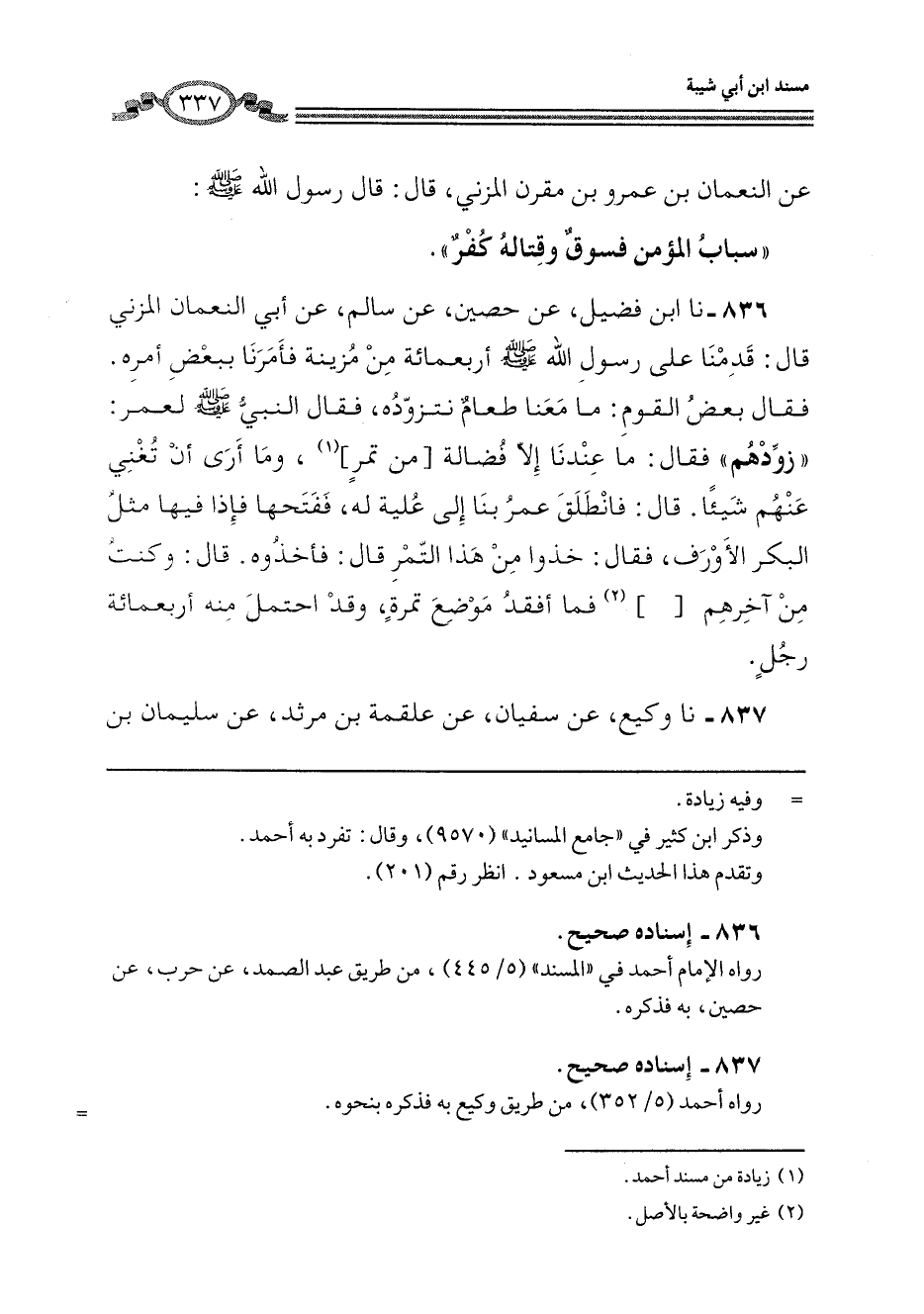 836 - نا ابْنُ فُضَيْلٍ، عَنْ حُصَيْنٍ، عَنْ سَالِمٍ، عَنْ أَبِي النُّعْمَانِ الْمُزَنِيِّ قَالَ: قَدِمْنَا عَلَى رَسُولِ اللَّهِ صَلَّى اللهُ عَلَيْهِ وَسَلَّمَ أَرْبَعَمِائَةٍ مِنْ مُزَيْنَةَ فَأَمَرَنَا بِبَعْضِ أَمْرِهِ، فَقَالَ بَعْضُ الْقَوْمِ: §مَا مَعَنَا طَعَامٌ نَتَزَوَّدُهُ، فَقَالَ النَّبِيُّ صَلَّى اللهُ عَلَيْهِ وَسَلَّمَ لِعُمَرَ: «زَوِّدْهُمْ» فَقَالَ: مَا عِنْدَنَا إِلَّا فَضَالَةٌ مِنْ تَمْرٍ، وَمَا أَرَى أَنْ تُغْنِيَ عَنْهُمْ شَيْئًا، قَالَ: فَانْطَلَقَ عُمَرُ بِنَا إِلَى عُلَيَّةٍ لَهُ، فَفَتَحَهَا فَإِذَا فِيهَا مِثْلُ الْبَكْرِ الْأَوْرَقِ، فَقَالَ: خُذُوا مِنْ هَذَا التَّمْرِ قَالَ: فَأَخَذُوهُ. قَالَ: وَكُنْتُ مِنْ آخِرِهِمْ فَمَا أَفْقِدُ مَوْضِعَ تَمْرَةٍ، وَقَدِ احْتَمَلَ مِنْهُ أَرْبَعُمِائَةِ رَجُلٍ