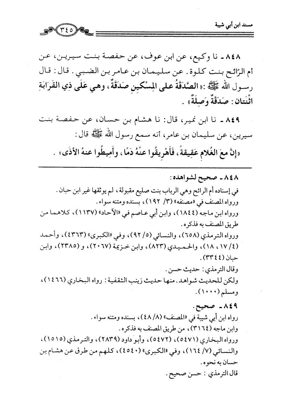 849 - نا ابْنُ نُمَيْرٍ، قَالَ: نا هِشَامُ بْنُ حَسَّانَ، عَنْ حَفْصَةَ بِنْتِ سِيرِينَ، عَنْ سُلَيْمَانَ بْنِ عَامِرٍ، أَنَّهُ سَمِعَ رَسُولَ اللَّهِ صَلَّى اللهُ عَلَيْهِ وَسَلَّمَ قَالَ: «إِنَّ §مَعَ الْغُلَامِ عَقِيقَةً، فَأَهْرِيقُوا عَنْهُ دَمًا، وَأَمِيطُوا عَنْهُ الْأَذَى»