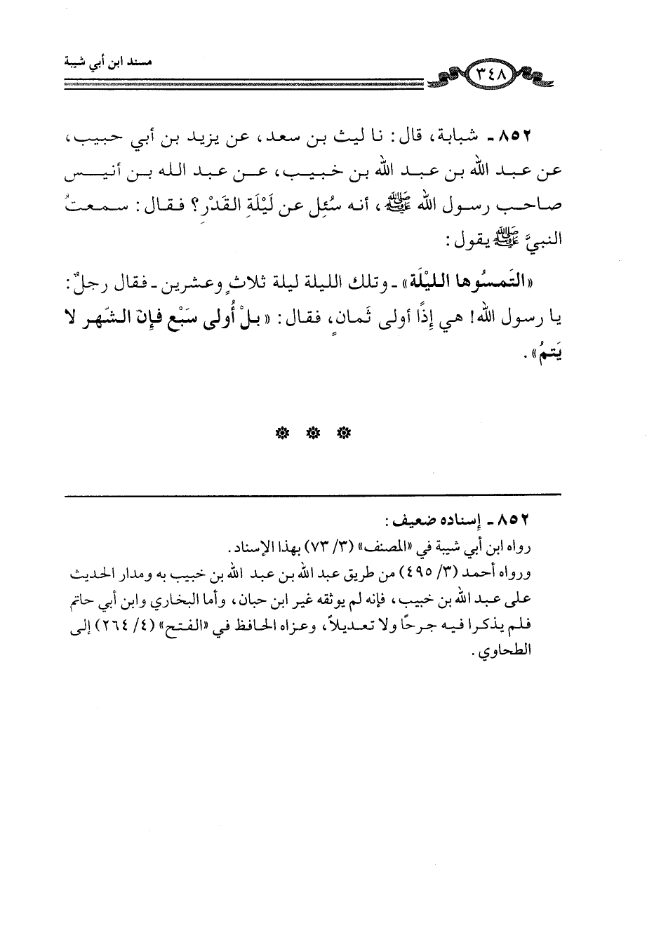 852 - شَبَابَةُ، قَالَ: نا لَيْثُ بْنُ سَعْدٍ، عَنْ يَزِيدَ بْنِ أَبِي حَبِيبٍ، عَنْ عَبْدِ اللَّهِ بْنِ عَبْدِ اللَّهِ بْنِ خُبَيْبٍ، عَنْ عَبْدِ اللَّهِ بْنِ أُنَيْسٍ، صَاحِبِ رَسُولِ اللَّهِ صَلَّى اللهُ عَلَيْهِ وَسَلَّمَ أَنَّهُ سُئِلَ عَنْ لَيْلَةِ الْقَدْرِ؟ فَقَالَ: سَمِعْتُ النَّبِيَّ صَلَّى اللهُ عَلَيْهِ وَسَلَّمَ يَقُولُ: «الْتَمِسُوهَا اللَّيْلَةَ» - وَتِلْكَ اللَّيْلَةُ لَيْلَةُ ثَلَاثٍ وَعِشْرِينَ - فَقَالَ رَجُلٌ: يَا رَسُولَ اللَّهِ، هِيَ إِذًا أُولَى ثَمَانٍ، فَقَالَ: «بَلْ §أُولَى سَبْعٍ فَإِنَّ الشَّهْرَ لَا يَتِمُّ»
