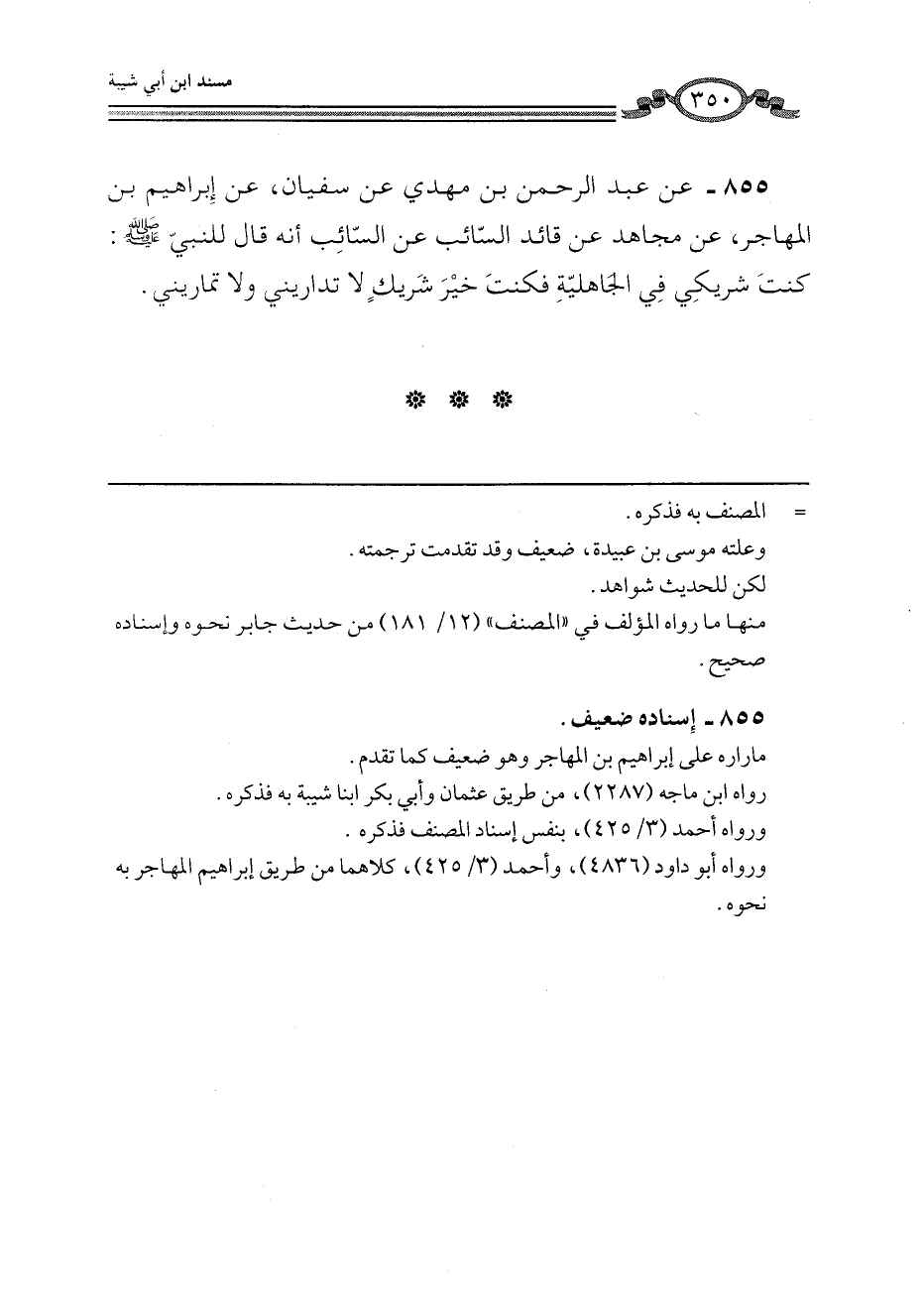 855 - عَنْ عَبْدِ الرَّحْمَنِ بْنِ مَهْدِيٍّ، عَنْ سُفْيَانَ، عَنْ إِبْرَاهِيمَ بْنِ الْمُهَاجِرِ، عَنْ مُجَاهِدٍ، عَنْ قَائِدِ السَّائِبِ، عَنِ السَّائِبِ، أَنَّهُ قَالَ لِلنَّبِيِّ صَلَّى اللهُ عَلَيْهِ وَسَلَّمَ: «كُنْتَ شَرِيكِي فِي الْجَاهِلِيَّةِ فَكُنْتَ خَيْرَ شَرِيكٍ §لَا تُدَارِينِي وَلَا تُمَارِينِي»