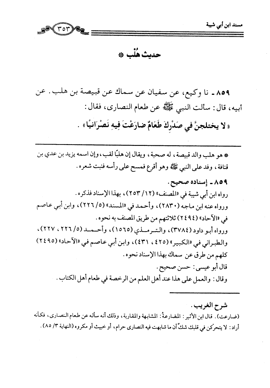 859 - نا وَكِيعٌ، عَنْ سُفْيَانَ، عَنْ سِمَاكٍ، عَنْ قَبِيصَةَ بْنِ هُلْبٍ، عَنْ أَبِيهِ، قَالَ: سَأَلْتُ النَّبِيَّ صَلَّى اللهُ عَلَيْهِ وَسَلَّمَ عَنْ طَعَامِ النَّصَارَى، فَقَالَ: «§لَا يَخْتَلِجَنَّ فِي صَدْرِكَ طَعَامٌ ضَارَعْتَ فِيهِ نَصْرَانِيًّا»