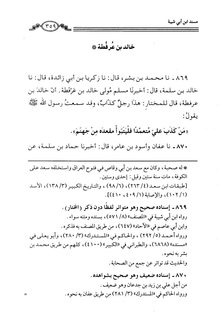 869 - نا مُحَمَّدُ بْنُ بِشْرٍ، قَالَ: نا زَكَرِيَّا بْنُ أَبِي زَائِدَةَ، قَالَ: نا خَالِدُ بْنُ سَلَمَةَ، قَالَ: أَخْبَرَنَا مُسْلِمٌ، مَوْلَى خَالِدِ بْنِ عُرْفُطَةَ، أَنَّ خَالِدَ بْنَ عُرْفُطَةَ، قَالَ لِلْمُخْتَارِ: هَذَا رَجُلٌ كَذَّابٌ، وَقَدْ سَمِعْتُ رَسُولَ اللَّهِ صَلَّى اللهُ عَلَيْهِ وَسَلَّمَ يَقُولُ: «§مَنْ كَذَبَ عَلَيَّ مُتَعَمِّدًا فَلْيَتَبَوَّأْ مَقْعَدَهُ مِنْ جَهَنَّمَ»