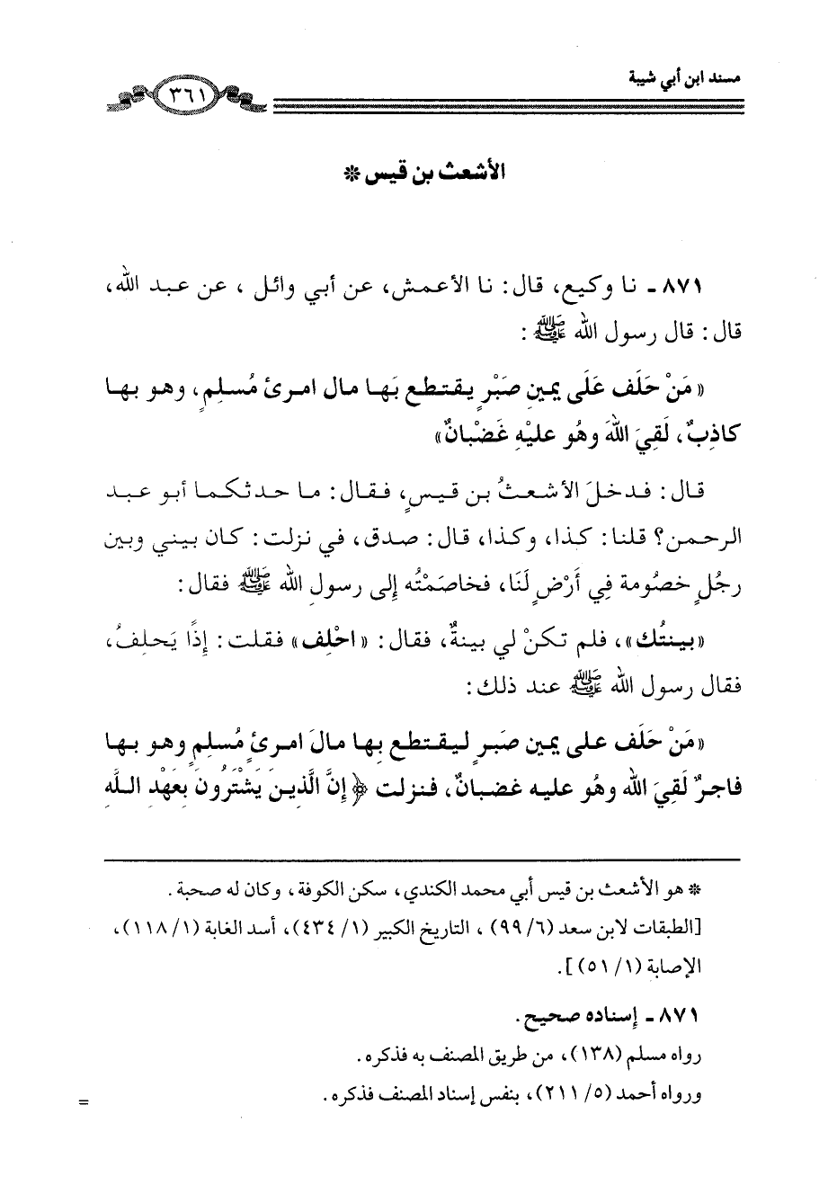 871 - نا وَكِيعٌ، قَالَ: نا الْأَعْمَشُ، عَنْ أَبِي وَائِلٍ، عَنْ عَبْدِ اللَّهِ، قَالَ: قَالَ رَسُولُ اللَّهِ صَلَّى اللهُ عَلَيْهِ وَسَلَّمَ: «§مَنْ حَلَفَ عَلَى يَمِينِ صَبْرٍ يَقْتَطِعُ بِهَا مَالَ امْرِئٍ مُسْلِمٍ، وَهُوَ بِهَا كَاذِبٌ، لَقِيَ اللَّهَ وَهُوَ عَلَيْهِ غَضْبَانُ» قَالَ: فَدَخَلَ الْأَشْعَثُ بْنُ قَيْسٍ، فَقَالَ: مَا حَدَّثَكُمَا أَبُو عَبْدِ الرَّحْمَنِ؟ قُلْنَا: كَذَا وَكَذَا، قَالَ: صَدَقَ، فِيَّ نَزَلَتْ: كَانَ بَيْنِي وَبَيْنَ رَجُلٍ خُصُومَةٌ فِي أَرْضٍ لَنَا، فَخَاصَمْتُهُ إِلَى رَسُولِ اللَّهِ صَلَّى اللهُ عَلَيْهِ وَسَلَّمَ فَقَالَ: «بَيِّنَتُكَ» ، فَلَمْ تَكُنْ لِي بَيِّنَةٌ، فَقَالَ: «احْلِفْ» فَقُلْتُ: إِذًا يَحْلِفُ، فَقَالَ رَسُولُ اللَّهِ صَلَّى اللهُ عَلَيْهِ وَسَلَّمَ عِنْدَ ذَلِكَ: " مَنْ حَلَفَ عَلَى يَمِينِ صَبْرٍ لِيَقْتَطِعَ بِهَا مَالَ امْرِئٍ مُسْلِمٍ وَهُوَ بِهَا فَاجِرٌ، لَقِيَ اللَّهَ وَهُوَ عَلَيْهِ غَضْبَانُ، فَنَزَلَتْ {إِنَّ الَّذِينَ يَشْتَرُونَ بِعَهْدِ اللَّهِ -[362]- وَأَيْمَانِهِمْ ثَمَنًا قَلِيلًا. . . .} [آل عمران: 77] الْآيَةَ
