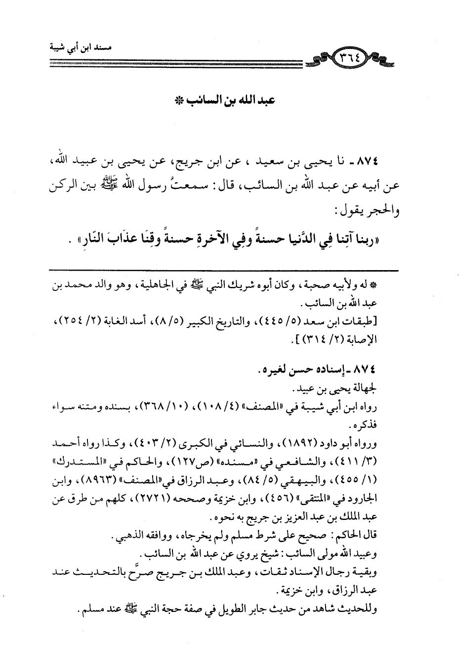 874 - نا يَحْيَى بْنُ سَعِيدٍ، عَنِ ابْنِ جُرَيْجٍ، عَنْ يَحْيَى بْنِ عُبَيْدِ اللَّهِ، عَنْ أَبِيهِ، عَنْ عَبْدِ اللَّهِ بْنِ السَّائِبِ، قَالَ: سَمِعْتُ رَسُولَ اللَّهِ صَلَّى اللهُ عَلَيْهِ وَسَلَّمَ بَيْنَ الرُّكْنِ وَالْحَجَرِ يَقُولُ: «§رَبَّنَا آتِنَا فِي الدُّنْيَا حَسَنَةً، وَفِي الْآخِرَةِ حَسَنَةً، وَقِنَا عَذَابَ النَّارِ»