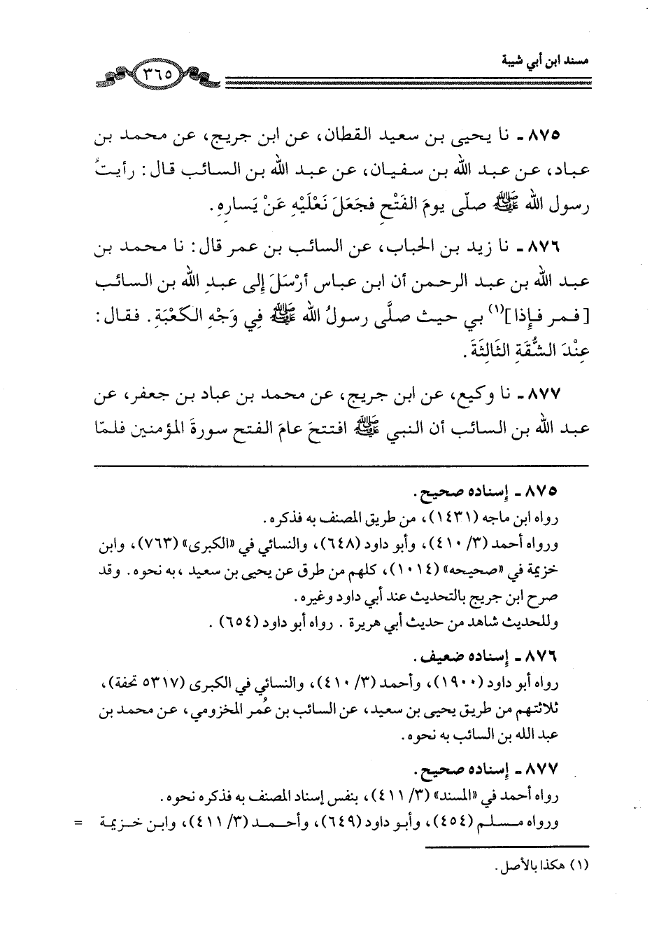 875 - نا يَحْيَى بْنُ سَعِيدٍ الْقَطَّانُ، عَنِ ابْنِ جُرَيْجٍ، عَنْ مُحَمَّدِ بْنِ عَبَّادٍ، عَنْ عَبْدِ اللَّهِ بْنِ سُفْيَانَ، عَنْ عَبْدِ اللَّهِ بْنِ السَّائِبِ، قَالَ: رَأَيْتُ رَسُولَ اللَّهِ صَلَّى اللهُ عَلَيْهِ وَسَلَّمَ «§صَلَّى يَوْمَ الْفَتْحِ فَجَعَلَ نَعْلَيْهِ عَنْ يَسَارِهِ»