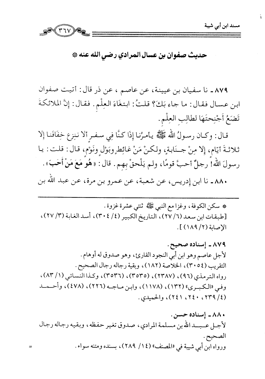 879 - نا سُفْيَانُ بْنُ عُيَيْنَةَ، عَنْ عَاصِمٍ، عَنْ زِرٍّ، قَالَ: أَتَيْتُ صَفْوَانَ بْنَ عَسَّالٍ فَقَالَ: مَا جَاءَ بِكَ؟ قُلْتُ: ابْتِغَاءَ الْعِلْمِ، فَقَالَ: إِنَّ الْمَلَائِكَةَ تَضَعُ أَجْنِحَتَهَا لِطَالِبِ الْعِلْمِ " قَالَ: وَكَانَ رَسُولُ اللَّهِ صَلَّى اللهُ عَلَيْهِ وَسَلَّمَ يَأْمُرُنَا إِذَا كُنَّا فِي سَفَرٍ أَلَّا نَنْزِعَ خِفَافَنَا إِلَّا ثَلَاثَةَ أَيَّامٍ، إِلَّا مِنْ جَنَابَةٍ، وَلَكِنْ مِنْ غَائِطٍ وَبَوْلٍ وَنَوْمٍ، قَالَ: قُلْتُ: يَا رَسُولَ اللَّهِ، §رَجُلٌ أَحَبَّ قَوْمًا، وَلَمْ يَلْحَقْ بِهِمْ، قَالَ: «هُوَ مَعَ مَنْ أَحَبَّ»