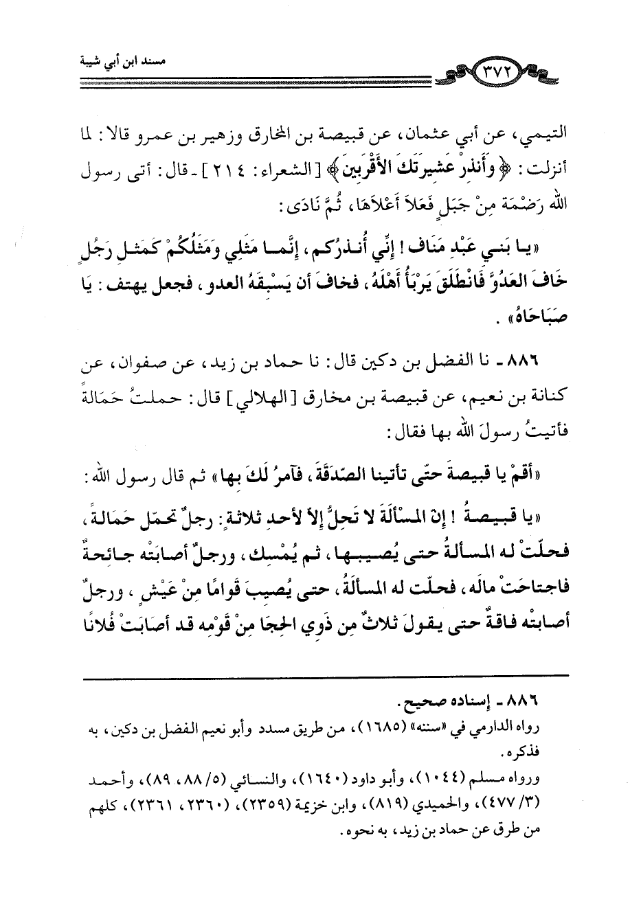 886 - نا الْفَضْلُ بْنُ دُكَيْنٍ، قَالَ: نا حَمَّادُ بْنُ زَيْدٍ، عَنْ صَفْوَانَ، عَنْ كِنَانَةَ بْنِ نُعَيْمٍ، عَنْ قَبِيصَةَ بْنِ مُخَارِقٍ الْهِلَالِيِّ، قَالَ: حَمَلْتُ حِمَالَةً فَأَتَيْتُ رَسُولَ اللَّهِ بِهَا فَقَالَ: «أَقِمْ يَا قَبِيصَةُ حَتَّى تَأْتِيَنَا الصَّدَقَةُ، فَآمُرُ لَكَ بِهَا» ثُمَّ قَالَ رَسُولُ اللَّهِ: " يَا قَبِيصَةُ، إِنَّ §الْمَسْأَلَةَ لَا تَحِلُّ إِلَّا لِأَحَدِ ثَلَاثَةٍ: رَجُلٍ تَحَمَّلَ حِمَالَةً فَحَلَّتْ لَهُ الْمَسْأَلَةُ حَتَّى يُصِيبَهَا ثُمَّ يُمْسِكُ، وَرَجُلٌ أَصَابَتْهُ جَائِحَةٌ فَاجْتَاحَتْ مَالَهُ، فَحَلَّتْ لَهُ الْمَسْأَلَةُ، حَتَّى يُصِيبَ قِوَامًا مِنْ عَيْشٍ، وَرَجُلٍ أَصَابَتْهُ فَاقَةٌ حَتَّى يَقُولَ ثَلَاثٌ مِنْ ذَوِي الْحِجَا مِنْ قَوْمِهِ: قَدْ أَصَابَتْ فُلَانًا -[373]- فَاقَةٌ فَحَلَّتْ لَهُ الْمَسْأَلَةُ، حَتَّى يُصِيبَ قِوَامًا مِنْ عَيْشٍ. يَا قَبِيصَةُ، فَمَا سِوَاهُنَّ مِنَ الْمَسْأَلَةِ سُحْتٌ يَأْكُلُهَا صَاحِبُهَا "
