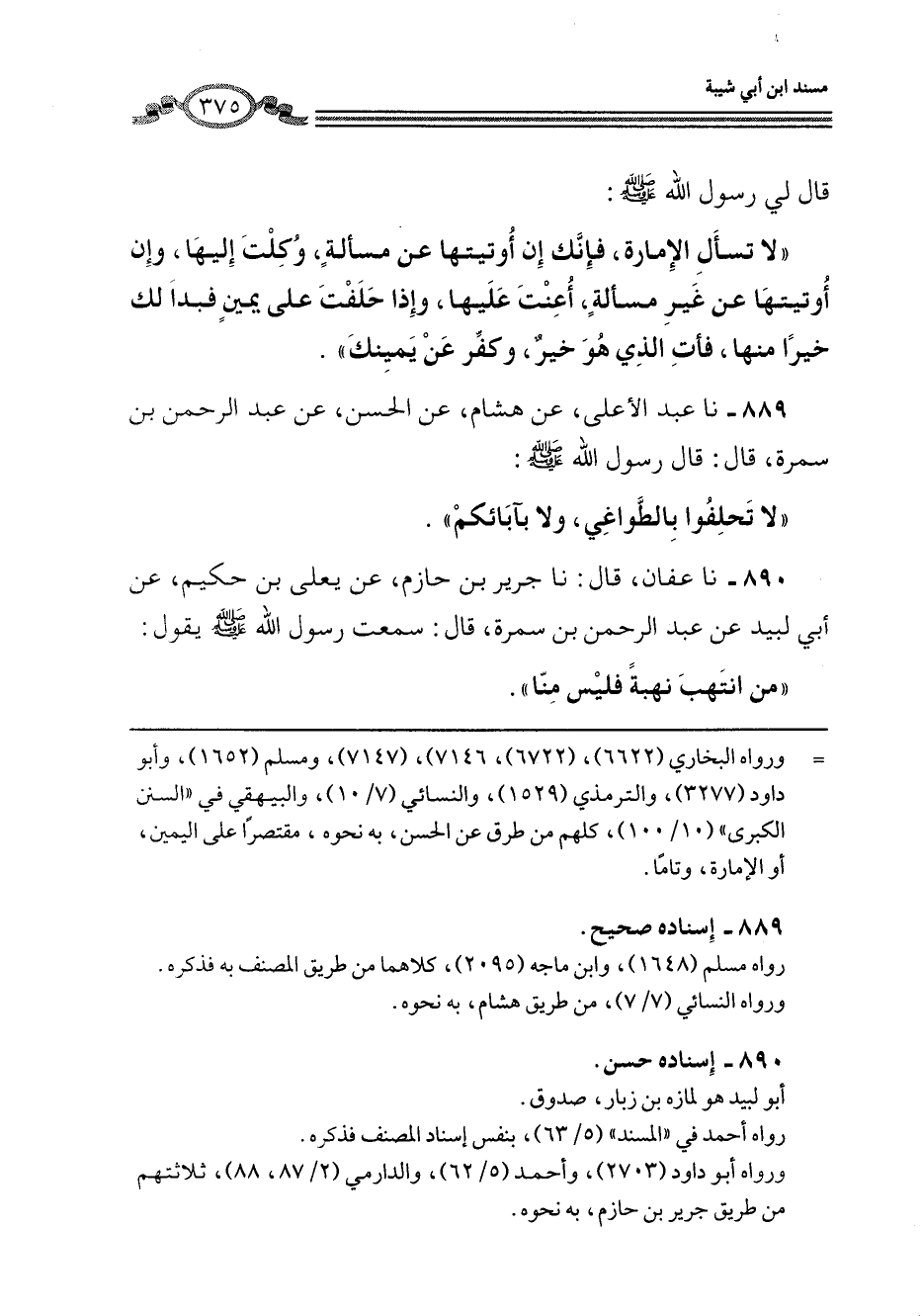 889 - نا عَبْدُ الْأَعْلَى، عَنْ هِشَامٍ، عَنِ الْحَسَنِ، عَنْ عَبْدِ الرَّحْمَنِ بْنِ سَمُرَةَ، قَالَ: قَالَ رَسُولُ اللَّهِ صَلَّى اللهُ عَلَيْهِ وَسَلَّمَ: «§لَا تَحْلِفُوا بِالطَّوَاغِي وَلَا بِآبَائِكُمْ»