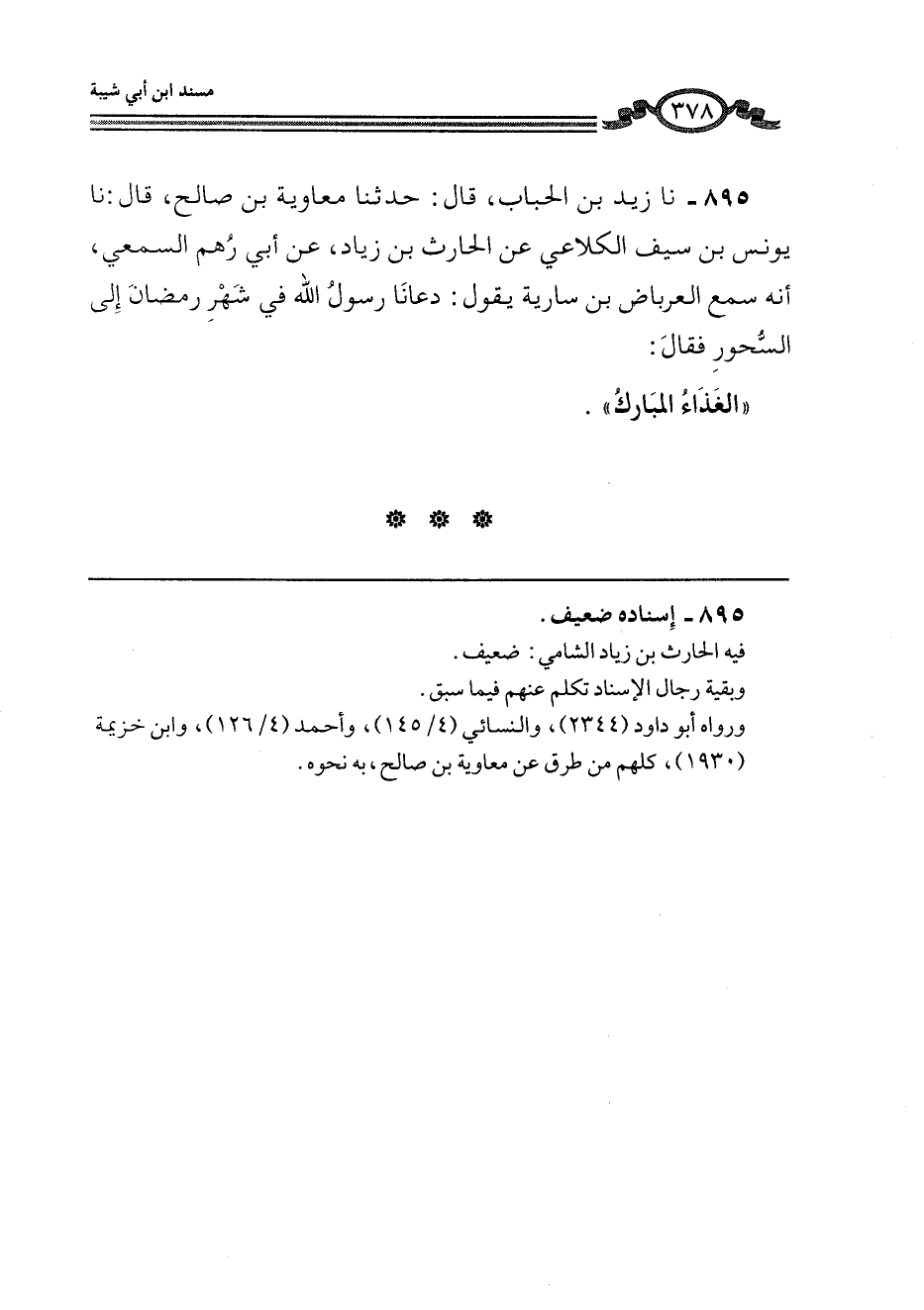 895 - نا زَيْدُ بْنُ الْحُبَابِ، قَالَ: حَدَّثَنَا مُعَاوِيَةُ بْنُ صَالِحٍ، قَالَ: نا يُونُسُ بْنُ سَيْفٍ الْكَلَاعِيُّ، عَنِ الْحَارِثِ بْنِ زِيَادٍ، عَنْ أَبِي رُهْمٍ السَّمَعِيِّ، أَنَّهُ سَمِعَ الْعِرْبَاضَ بْنَ سَارِيَةَ، يَقُولُ: §دَعَانَا رَسُولُ اللَّهِ فِي شَهْرِ رَمَضَانَ إِلَى السَّحُورِ فَقَالَ: «الْغِذَاءُ الْمُبَارَكُ»