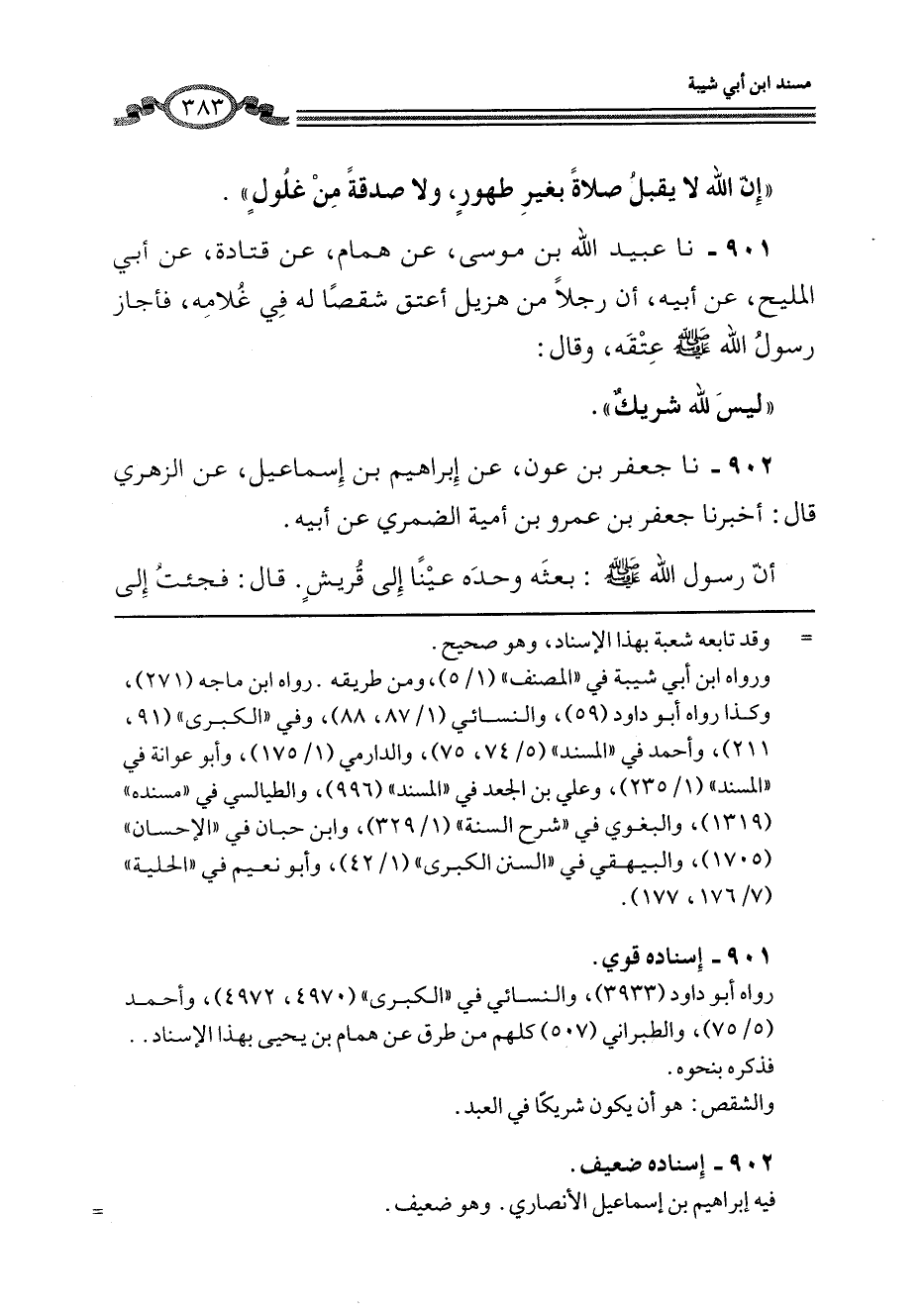901 - نا عُبَيْدُ اللَّهِ بْنُ مُوسَى، عَنْ هَمَّامٍ، عَنْ قَتَادَةَ، عَنْ أَبِي الْمَلِيحِ، عَنْ أَبِيهِ، أَنَّ رَجُلًا مِنْ هُذَيْلٍ أَعْتَقَ شِقْصًا لَهُ فِي غُلَامِهِ، فَأَجَازَ رَسُولُ اللَّهِ صَلَّى اللهُ عَلَيْهِ وَسَلَّمَ عِتْقَهُ، وَقَالَ: «§لَيْسَ لِلَّهِ شَرِيكٌ»