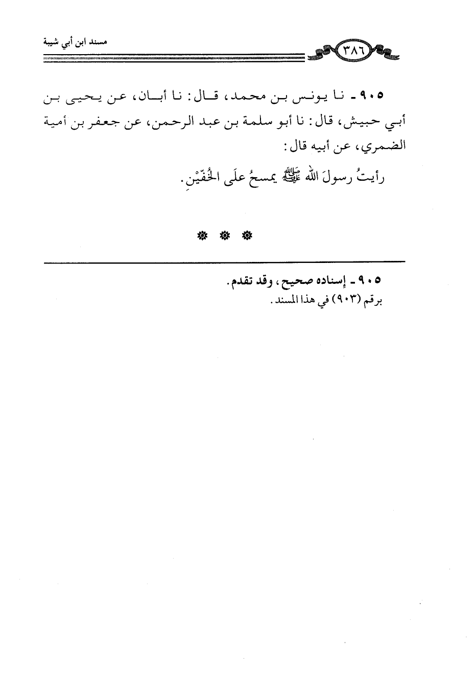 905 - نا يُونُسُ بْنُ مُحَمَّدٍ، قَالَ: نا أَبَانُ، عَنْ يَحْيَى بْنِ أَبِي كَثِيرٍ، قَالَ: نا أَبُو سَلَمَةَ بْنُ عَبْدِ الرَّحْمَنِ، عَنْ جَعْفَرِ بْنِ أُمَيَّةَ الضَّمْرِيِّ، عَنْ أَبِيهِ، قَالَ: رَأَيْتُ رَسُولَ اللَّهِ صَلَّى اللهُ عَلَيْهِ وَسَلَّمَ «§يَمْسَحُ عَلَى الْخُفَّيْنِ»