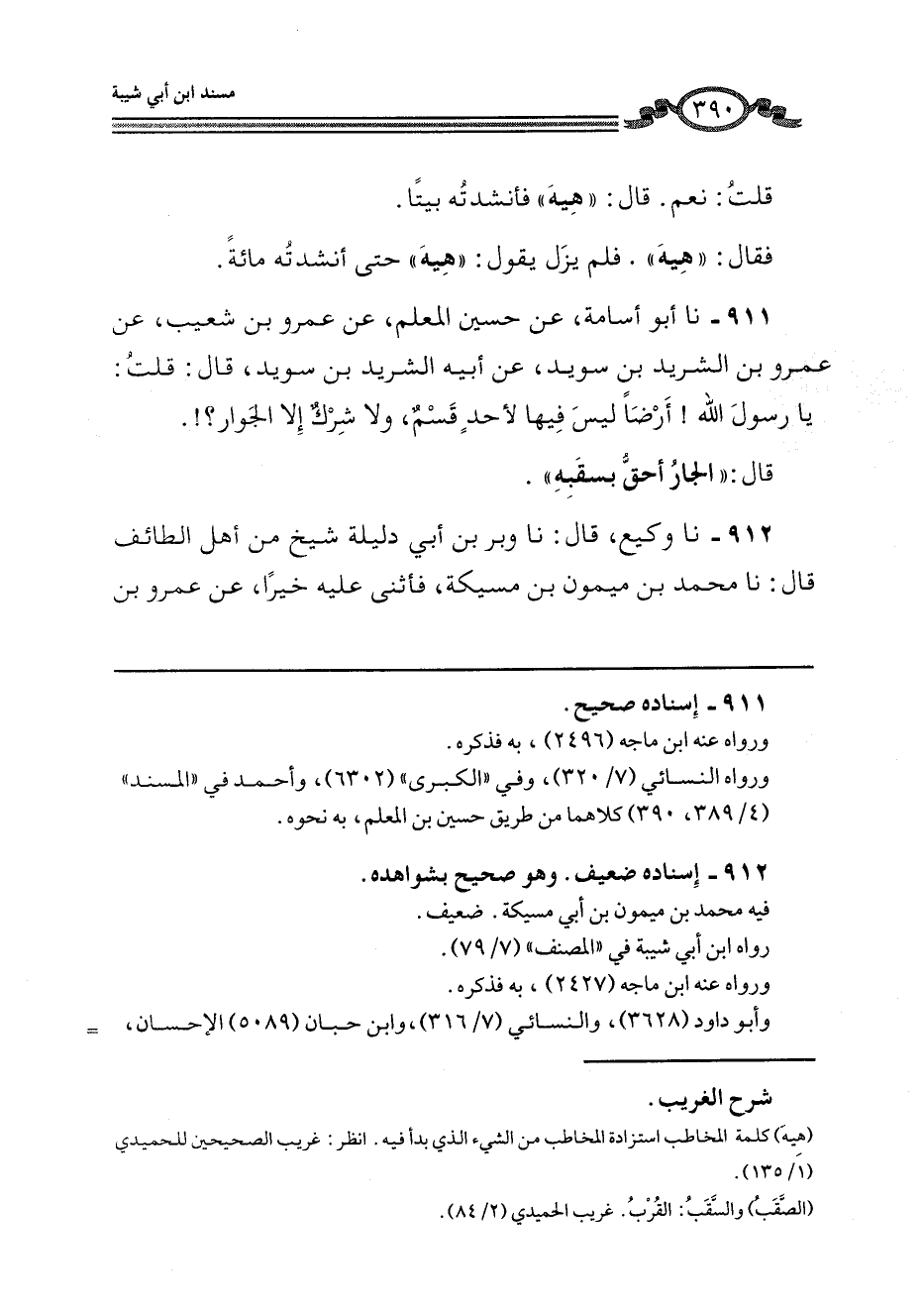 911 - نا أَبُو أُسَامَةَ، عَنْ حُسَيْنٍ الْمُعَلِّمِ، عَنْ عَمْرِو بْنِ شُعَيْبٍ، عَنْ عَمْرِو بْنِ الشَّرِيدِ بْنِ سُوَيْدٍ، عَنْ أَبِيهِ الشَّرِيدِ بْنِ سُوَيْدٍ، قَالَ: قُلْتُ: يَا رَسُولَ اللَّهِ، أَرْضٌ لَيْسَ فِيهَا لِأَحَدٍ قَسْمٌ، وَلَا شِرْكٌ إِلَّا الْجِوَارَ؟ قَالَ: «§الْجَارُ أَحَقُّ بِسَقَبِهِ»