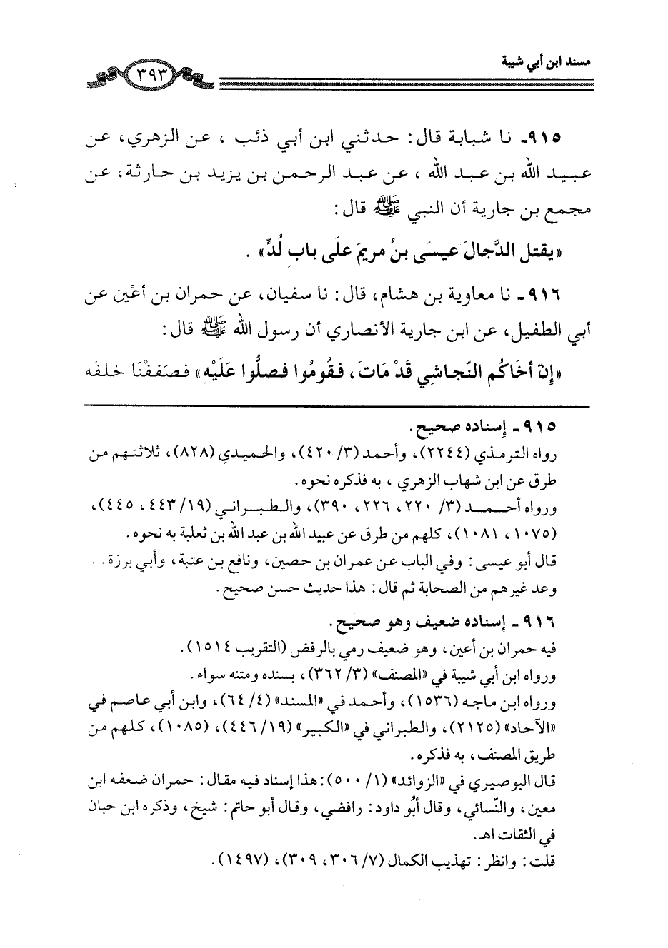 915 - نا شَبَابَةُ، قَالَ: حَدَّثَنِي ابْنُ أَبِي ذِئْبٍ، عَنِ الزُّهْرِيِّ، عَنْ عُبَيْدِ اللَّهِ بْنِ عَبْدِ اللَّهِ، عَنْ عَبْدِ الرَّحْمَنِ بْنِ يَزِيدَ بْنِ حَارِثَةَ، عَنْ مُجَمِّعِ بْنِ جَارِيَةَ، أَنَّ النَّبِيَّ صَلَّى اللهُ عَلَيْهِ وَسَلَّمَ قَالَ: «§يَقْتُلُ الدَّجَّالَ عِيسَى ابْنُ مَرْيَمَ عَلَى بَابِ لُدٍّ»