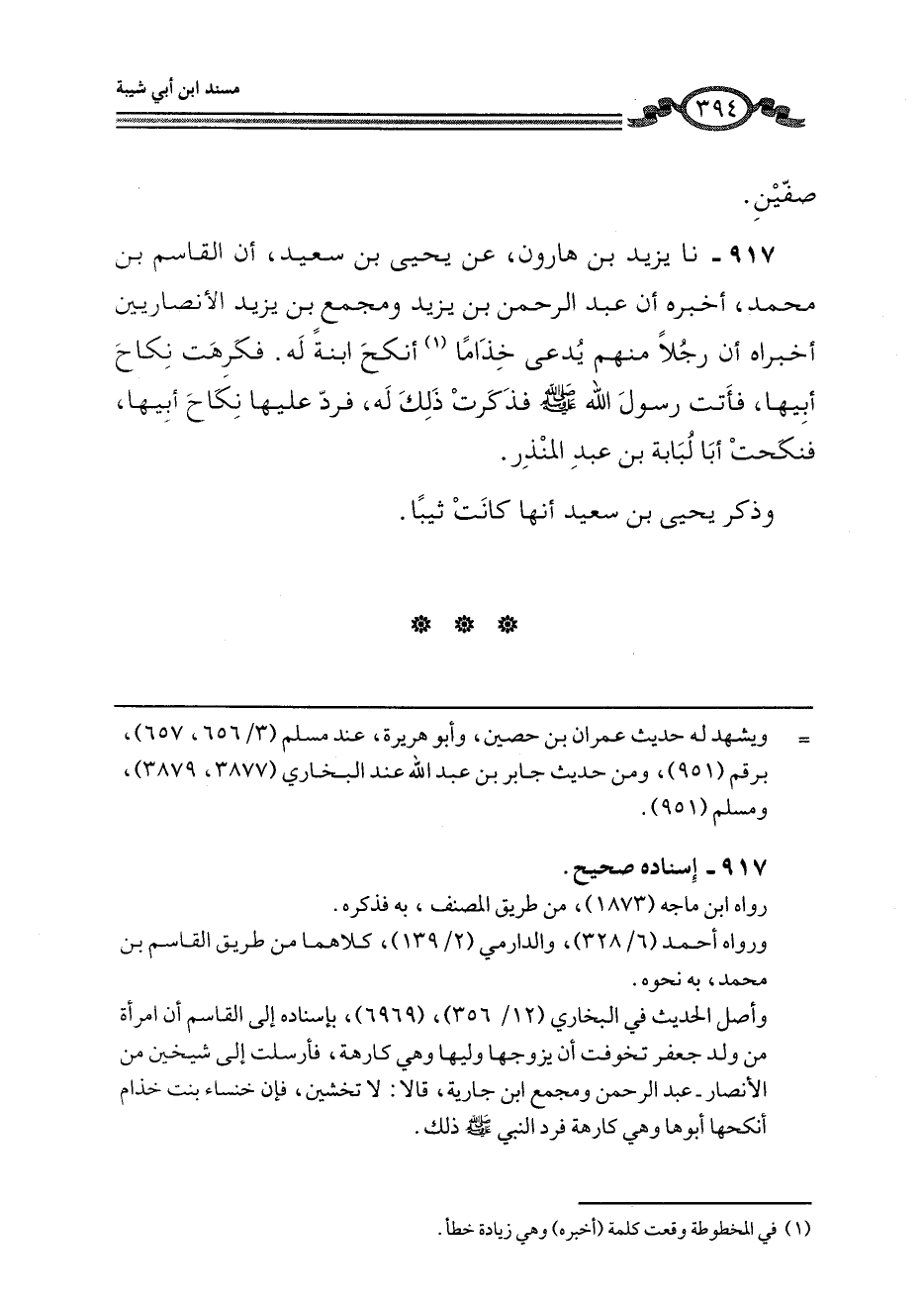 917 - نا يَزِيدُ بْنُ هَارُونَ، عَنْ يَحْيَى بْنِ سَعِيدٍ، أَنَّ الْقَاسِمَ بْنَ مُحَمَّدٍ، أَخْبَرَهُ أَنَّ عَبْدَ الرَّحْمَنِ بْنَ يَزِيدَ، وَمُجَمِّعَ بْنَ يَزِيدَ الْأَنْصَارِيَّيْنِ أَخْبَرَاهُ، «أَنَّ رَجُلًا مِنْهُمْ يُدْعَى §خِذَامًا أَنْكَحَ ابْنَةً لَهُ. فَكَرِهَتْ نِكَاحَ أَبِيهَا، فَأَتَتْ رَسُولَ اللَّهِ صَلَّى اللهُ عَلَيْهِ وَسَلَّمَ فَذَكَرَتْ ذَلِكَ لَهُ، فَرَدَّ عَلَيْهَا نِكَاحَ أَبِيهَا، فَنَكَحَتْ أَبَا لُبَابَةَ بْنَ عَبْدِ الْمُنْذِرِ» ، وَذَكَرَ يَحْيَى بْنُ سَعِيدٍ «أَنَّهَا كَانَتْ ثَيِّبًا»