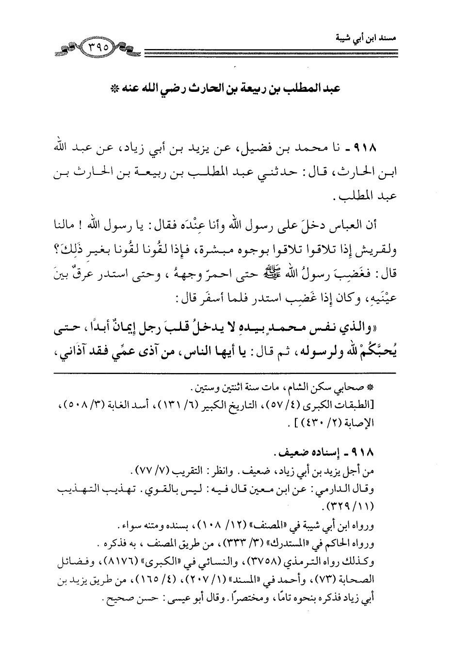 918 - نا مُحَمَّدُ بْنُ فُضَيْلٍ، عَنْ يَزِيدَ بْنِ أَبِي زِيَادٍ، عَنْ عَبْدِ اللَّهِ بْنِ الْحَارِثِ، قَالَ: حَدَّثَنِي عَبْدُ الْمُطَّلِبِ بْنُ رَبِيعَةَ بْنِ الْحَارِثِ بْنِ عَبْدِ الْمُطَّلِبِ، أَنَّ الْعَبَّاسَ دَخَلَ عَلَى رَسُولِ اللَّهِ وَأَنَا عِنْدَهُ فَقَالَ: يَا رَسُولَ اللَّهِ مَالَنَا وَلِقُرَيْشٍ إِذَا تَلَاقَوْا تَلَاقَوْا بِوُجُوهٍ مُبَشِّرَةٍ، فَإِذَا لَقُونَا لَقُونَا بِغَيْرِ ذَلِكَ؟ قَالَ: فَغَضِبَ رَسُولُ اللَّهِ صَلَّى اللهُ عَلَيْهِ وَسَلَّمَ حَتَّى احْمَرَّ وَجْهُهُ، وَحَتَّى اسْتَدَرَّ عِرْقٌ بَيْنَ عَيْنَيْهِ، وَكَانَ إِذَا غَضِبَ اسْتَدَرَّ فَلَمَّا أَسْفَرَ قَالَ: «وَالَّذِي نَفْسُ مُحَمَّدٍ بِيَدِهِ §لَا يَدْخُلُ قَلْبَ رَجُلٍ إِيمَانٌ أَبَدًا، حَتَّى يُحِبَّكُمْ لِلَّهِ وَلِرَسُولِهِ» ، ثُمَّ قَالَ: «يَا أَيُّهَا النَّاسُ، مَنْ آذَى عَمِّي فَقَدْ آذَانِي -[396]-، فَإِنَّمَا عَمٌّ الرَّجُلِ صِنْوُ أَبِيهِ»