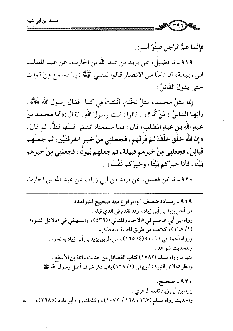 919 - نا ابْنُ فُضَيْلٍ، عَنْ يَزِيدَ، عَنْ عَبْدِ اللَّهِ بْنِ الْحَارِثِ، عَنْ عَبْدِ الْمُطَّلِبِ بْنِ رَبِيعَةَ، أَنَّ نَاسًا مِنَ الْأَنْصَارِ قَالُوا لِلنَّبِيِّ صَلَّى اللهُ عَلَيْهِ وَسَلَّمَ: إِنَّا نَسْمَعُ مِنْ قَوْلِكَ حَتَّى يَقُولَ الْقَائِلُ: إِنَّمَا مَثَلُ مُحَمَّدٍ مَثَلُ نَخْلَةٍ أَنْبَتَتْ فِي كِبَاءٍ، فَقَالَ رَسُولُ اللَّهِ صَلَّى اللهُ عَلَيْهِ وَسَلَّمَ: «أَيُّهَا النَّاسُ، مَنْ أَنَا؟» قَالُوا: أَنْتَ رَسُولُ اللَّهِ، فَقَالَ: «أَنَا مُحَمَّدُ بْنُ عَبْدِ اللَّهِ بْنِ عَبْدِ الْمُطَّلِبِ» قَالَ: فَمَا سَمِعْنَاهُ انْتَمَى قَبْلَهَا قَطُّ، ثُمَّ قَالَ: «إِنَّ §اللَّهَ خَلَقَ خَلْقَهُ ثُمَّ فَرَّقَهُمْ، فَجَعَلَنِي مِنْ خَيْرِ الْفِرْقَتَيْنِ، ثُمَّ جَعَلَهُمْ قَبَائِلَ، فَجَعَلَنِي مِنْ خَيْرِهِمْ قَبِيلَةً، ثُمَّ جَعَلَهُمْ بُيُوتًا، فَجَعَلَنِي مِنْ خَيْرِهِمْ بَيْتًا، فَأَنَا خَيْرُكُمْ بَيْتًا، وَخَيْرُكُمْ نَفْسًا»