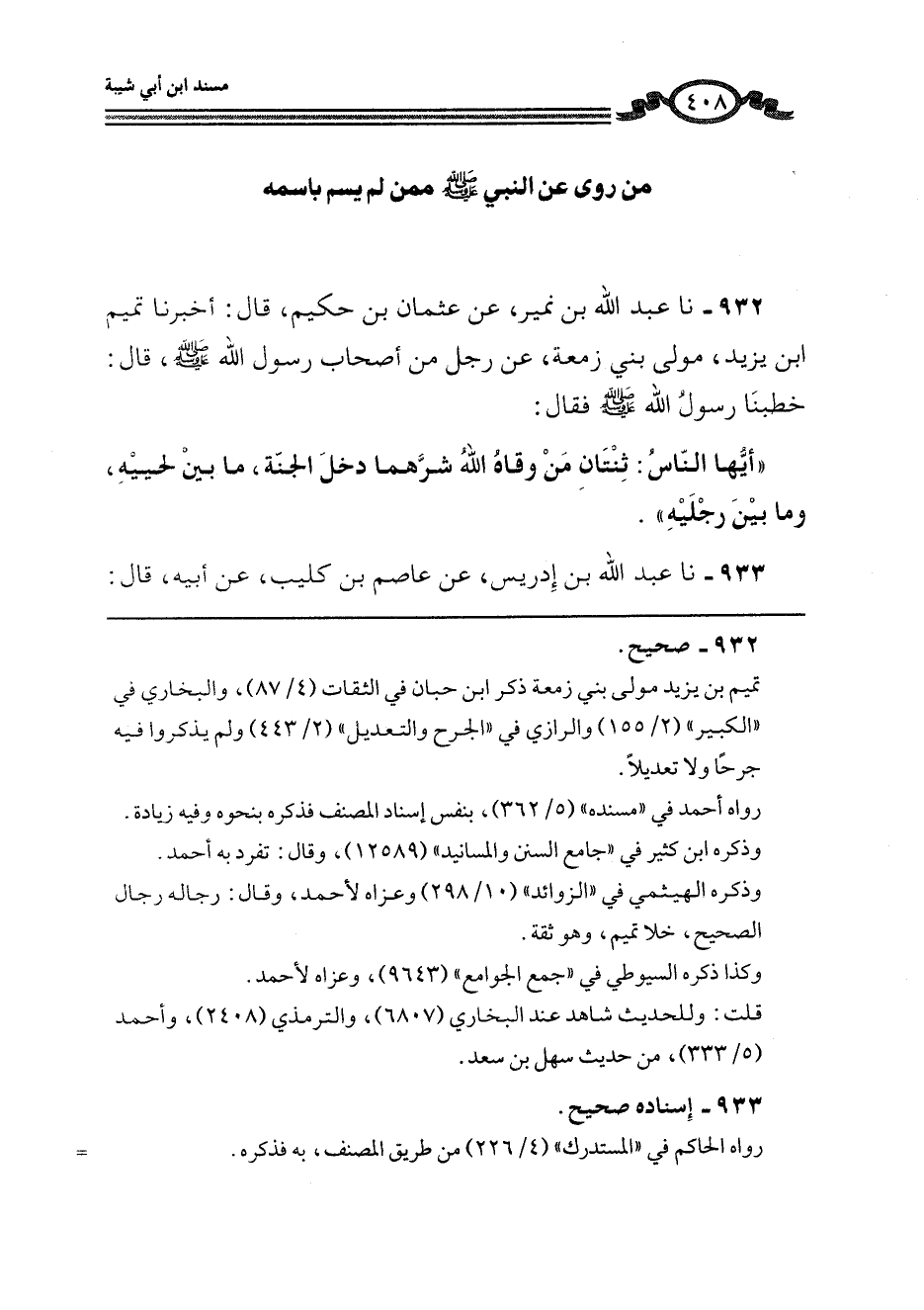 932 - نا عَبْدُ اللَّهِ بْنُ نُمَيْرٍ، عَنْ عُثْمَانَ بْنِ حَكِيمٍ، قَالَ: أَخْبَرَنَا تَمِيمُ بْنُ يَزِيدَ، مَوْلَى بَنِي زَمْعَةَ، عَنْ رَجُلٍ، مِنْ أَصْحَابِ رَسُولِ اللَّهِ صَلَّى اللهُ عَلَيْهِ وَسَلَّمَ قَالَ: خَطَبَنَا رَسُولُ اللَّهِ صَلَّى اللهُ عَلَيْهِ وَسَلَّمَ فَقَالَ: " أَيُّهَا النَّاسُ: §ثِنْتَانِ مِنْ وَقَاهُ اللَّهُ شَرَّهُمَا دَخَلَ الْجَنَّةَ، مَا بَيْنَ لَحْيَيْهِ وَمَا بَيْنَ رِجْلَيْهِ "
