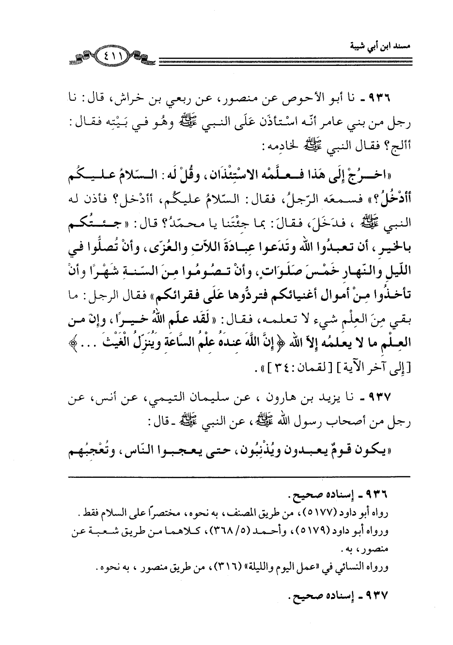 936 - نا أَبُو الْأَحْوَصِ، عَنْ مَنْصُورٍ، عَنْ رِبْعِيِّ بْنِ حِرَاشٍ، قَالَ: نا رَجُلٌ، مِنْ بَنِي عَامِرٍ، أَنَّهُ اسْتَأْذَنَ عَلَى النَّبِيِّ صَلَّى اللهُ عَلَيْهِ وَسَلَّمَ وَهُوَ فِي بَيْتِهِ فَقَالَ: أَأَلِجُ؟ فَقَالَ النَّبِيُّ صَلَّى اللهُ عَلَيْهِ وَسَلَّمَ لِخَادِمِهِ: " اخْرُجْ إِلَى هَذَا فَعَلِّمْهُ الِاسْتِئْذَانَ، وَقُلْ لَهُ: السَّلَامُ عَلَيْكُمْ أَأَدْخُلُ؟ " فَسَمِعَهُ الرَّجُلُ، فَقَالَ: السَّلَامُ عَلَيْكُمْ، أَأَدْخُلُ؟ فَأَذِنَ لَهُ النَّبِيُّ صَلَّى اللهُ عَلَيْهِ وَسَلَّمَ، فَدَخَلَ، فَقَالَ: بِمَا جِئْتَنَا يَا مُحَمَّدُ؟ قَالَ: «جِئْتُكُمْ بِالْخَيْرِ، أَنْ §تَعْبُدُوا اللَّهَ، وَتَدَعُوا عُبَادَةَ اللَّاتِ وَالْعُزَّى، وَأَنْ تُصَلُّوا فِي اللَّيْلِ وَالنَّهَارِ خَمْسَ صَلَوَاتٍ، وَأَنْ تَصُومُوا مِنَ السَّنَةِ شَهْرًا، وَأَنْ تَأْخُذُوا مِنْ أَمْوَالِ أَغْنِيَائِكُمْ فَتَرُدُّوهَا عَلَى فُقَرَائِكُمْ» فَقَالَ الرَّجُلُ: مَا بَقِيَ مِنَ الْعِلْمِ شَيْءٌ لَا تَعْلَمُهُ، فَقَالَ: " لَقَدْ عَلِمَ اللَّهُ خَيْرًا، وَإِنَّ مِنَ الْعِلْمِ مَا لَا يَعْلَمُهُ إِلَّا اللَّهُ {إِنَّ اللَّهَ عِنْدَهُ عِلْمُ السَّاعَةِ وَيُنَزِّلُ الْغَيْثَ. . .} [لقمان: 34] " إِلَى آخِرِ الْآيَةِ